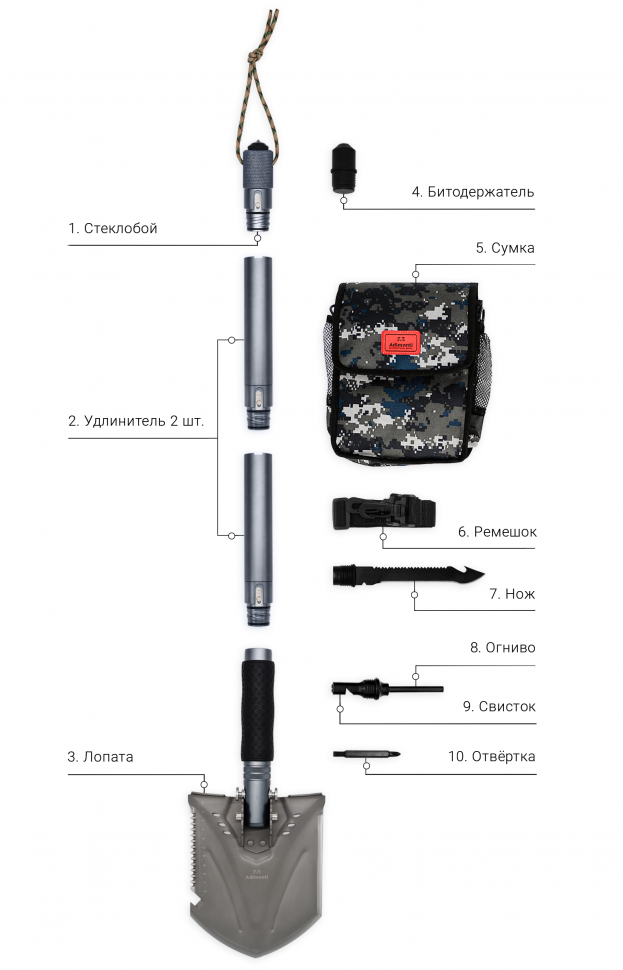 Доступний інструментарій даної моделі включає в себе ряд пристосувань, які є базовими для портативної туристичної лопати і зустрічаються в інших модифікаціях лопат Adimanti.
