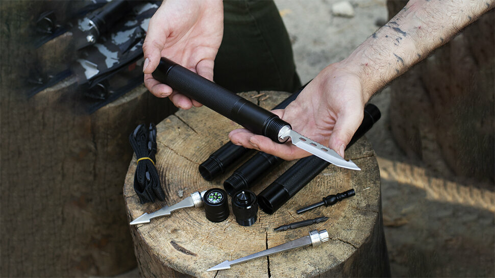 Живець збирається з двох пар алюмінієвих подовжувачів з шорсткою поверхнею. Їхня загальна довжина досягає 118 см. У живці знаходяться наступні елементи: льодоруб, ніж з подвійним заточуванням леза, острогу, що нагадує наконечник стріли, склобій, міні-версія викрутки та компас.