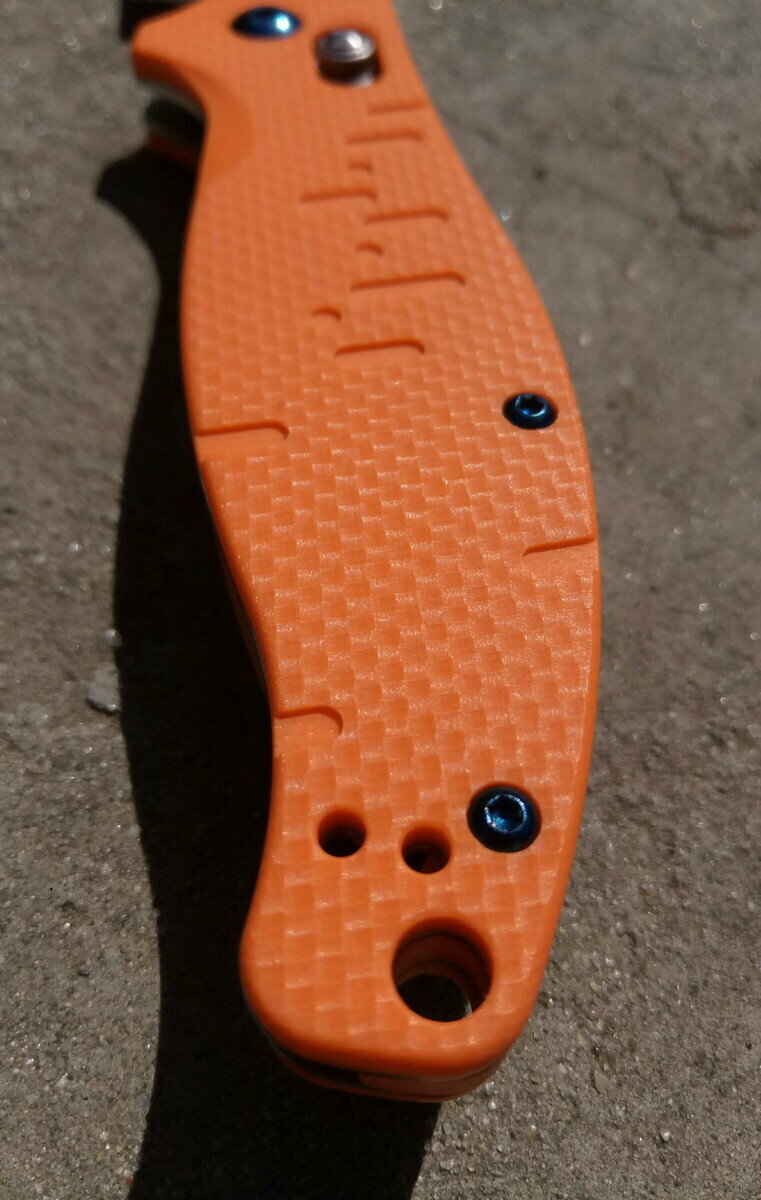У відкритому вигляді, насічка на обуху доповнюється насічками на лайнерах рукояті, що позитивно позначається на надійності хвата. До слова, цьому також сприяють ергономічна форма рукояті і чіпкі накладки з G10, поверхня яких стилізована під карбон і відчувається в руці як шорстка. Множинні глибокі виїмки не тільки виконують декоративну функцію, а й роблять хват більш надійним.