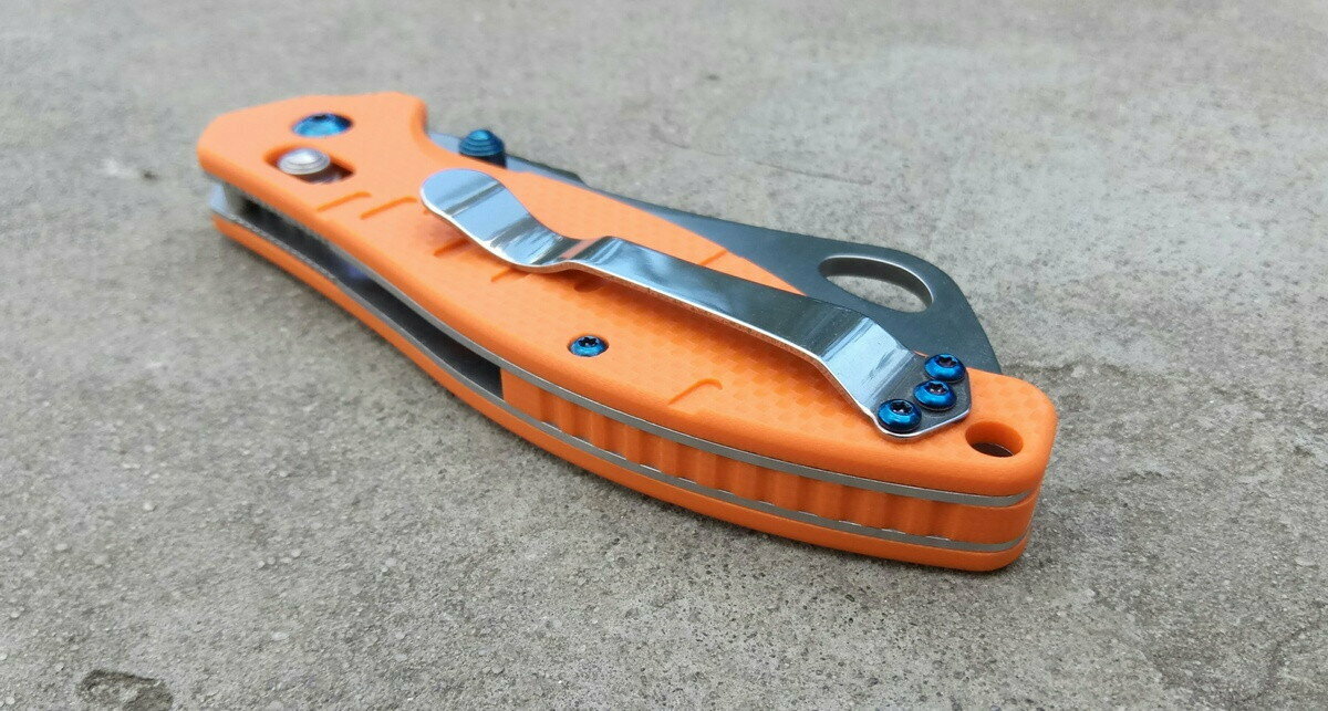 Витягується клинок за допомогою двостороннього шпенька, пофарбованого в синій колір. Отвір на клинку виконує суто декоративну функцію і не призначений для відкриття леза.