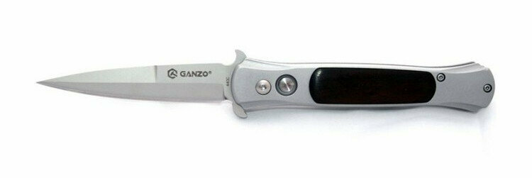 Викидний ніж Ganzo G707 поєднує в собі функціональність туристичного складного ножа і естетику середньовічного стилета. Він пропонує користувачеві вузький клинок довжиною 8.5 сантиметрів, сталеву рукоять з дерев'яними накладками, що зменшують ковзання моделі в долоні, і зручний механізм відкриття і блокування клинка Button Lock.