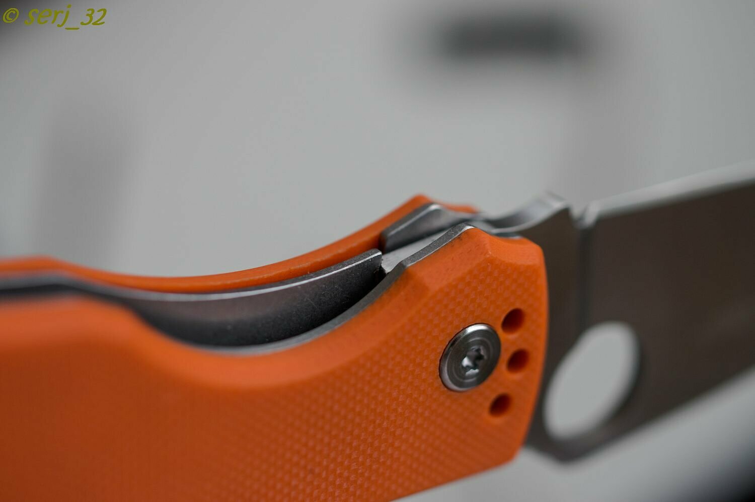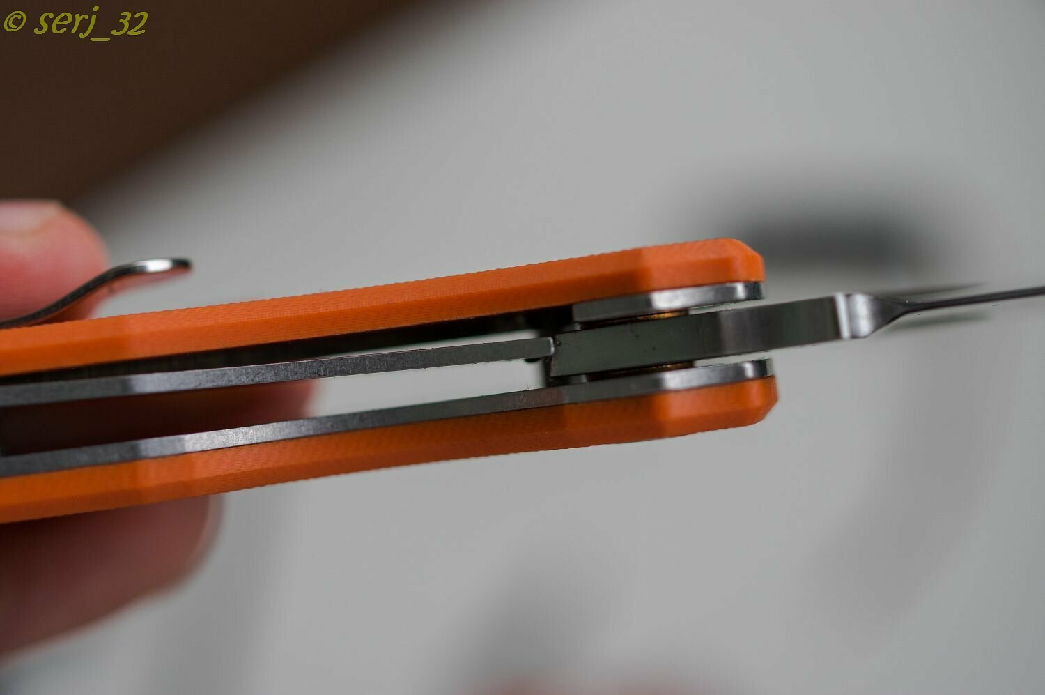 Замок Liner добре фіксує лезо, але він трохи виступає між рукоятями і цей виступ потрапляв мені на палець доставляючи незручність. До речі, у G732 обидві Шайби на клинку латунні, але невеликого діаметру.