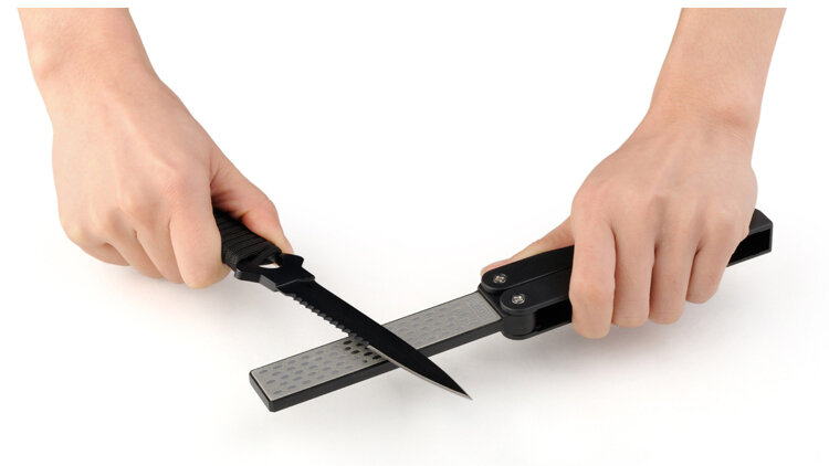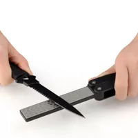 Спробуємо виконати з її допомогою ту ж процедуру, що і з минулого точилкою. Головне-потрапити в потрібний кут, в якому ніж вже заточений і проводити заточку рівно по всій довжині клинка. Це скоріше питання навичок, які досягаються з часом. Якщо відповідних умінь поки немає, краще потренуватися на старому кухонному ножі, оскільки ця точилка досить ефективно знімає метал і, не вміючи, ніж можна затупити.