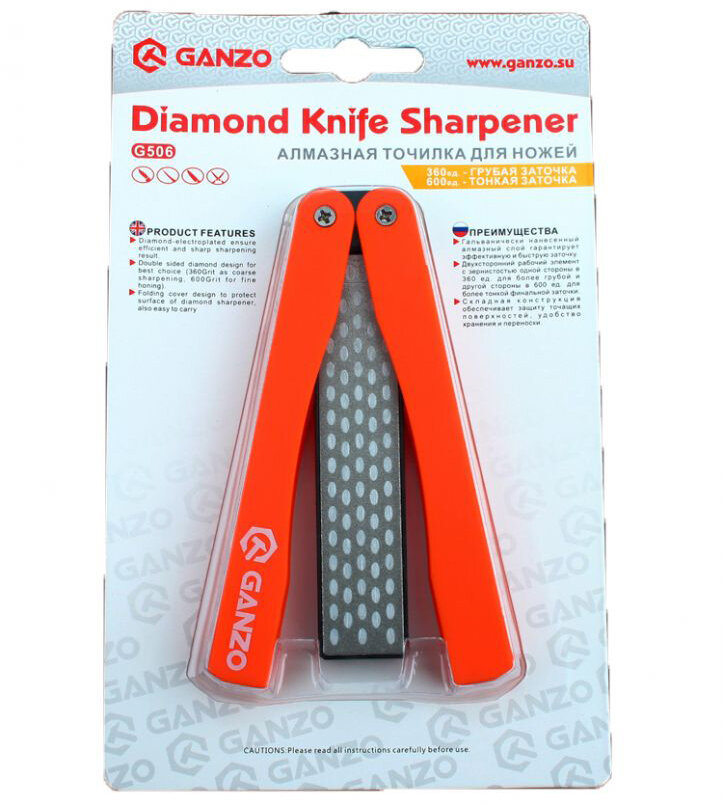 Друга модель в сьогоднішньому огляді-Ganzo G506. Це універсальний верстат для заточування ножів і ножиць. На поверхню точильного каменю нанесено Алмазне покриття, гритность якого з одного боку становить 360 мікрон і призначена для грубої заточки, а з іншого — 600 Мікрон, що підходить для фінішної заточки. Конструкція верстата розкладна, що особливо зручно для мисливців або рибалок. Ця точилка навіть з першого погляду виглядає більш серйозною, ніж попередня модель.