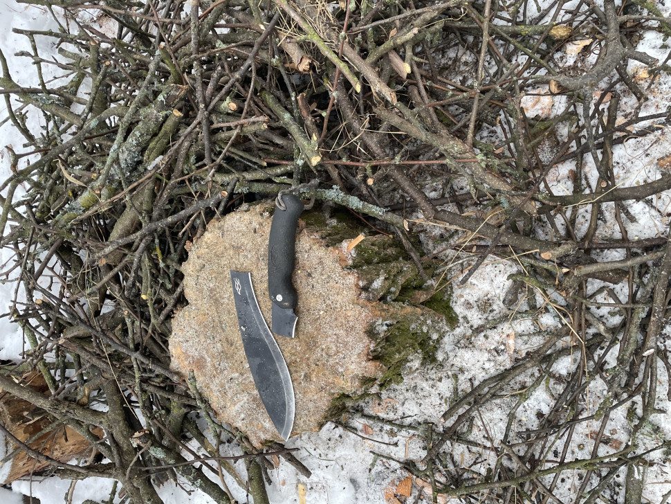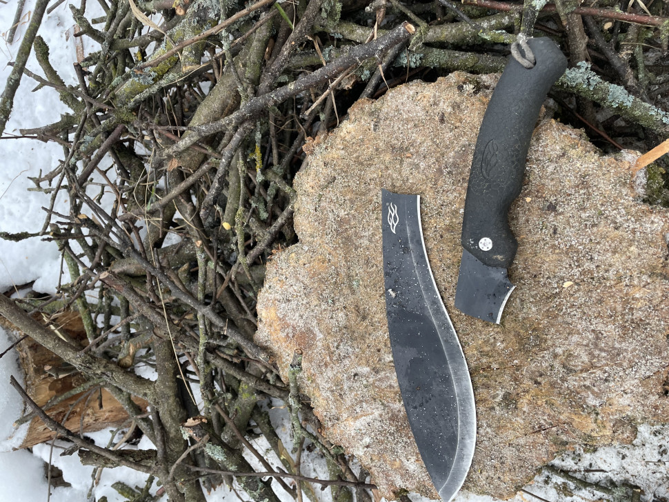 Купив у тому році цю забаву, пролежав до цього часу без діла а ось перевели нас на кордон так треба грубу топити. Сокирою крупні а думаю дрібні остатки порубаю своїм кукрі, але і пів години не попоацював як він розколовся навпіл. Сталь перекалена .