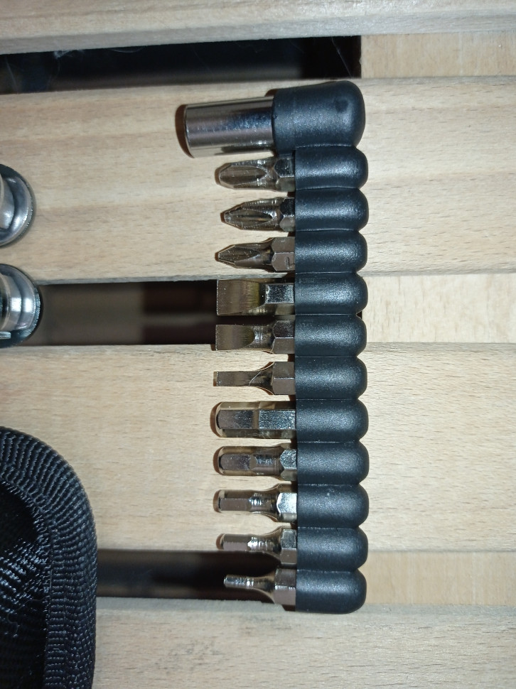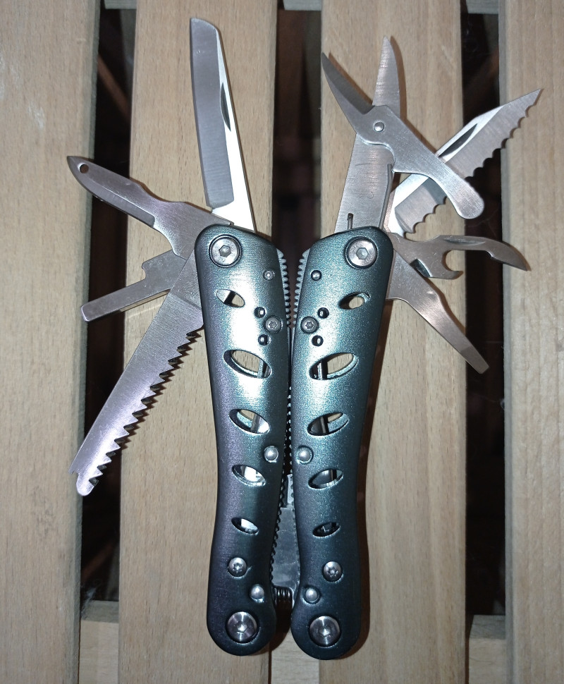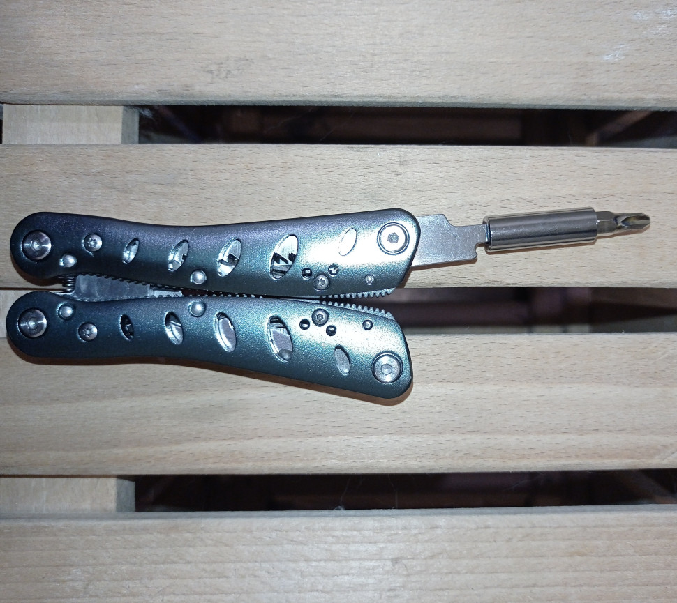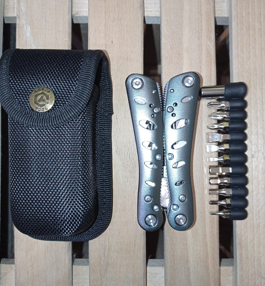 Недорогий та якісний мультитул з практично повним набором інструментів.Єдине що одразу замінив біти в наборі на більш якісні та потрібні саме мені види(частіше за все користуюсь плоскими,хрестовими та торксами бітами)