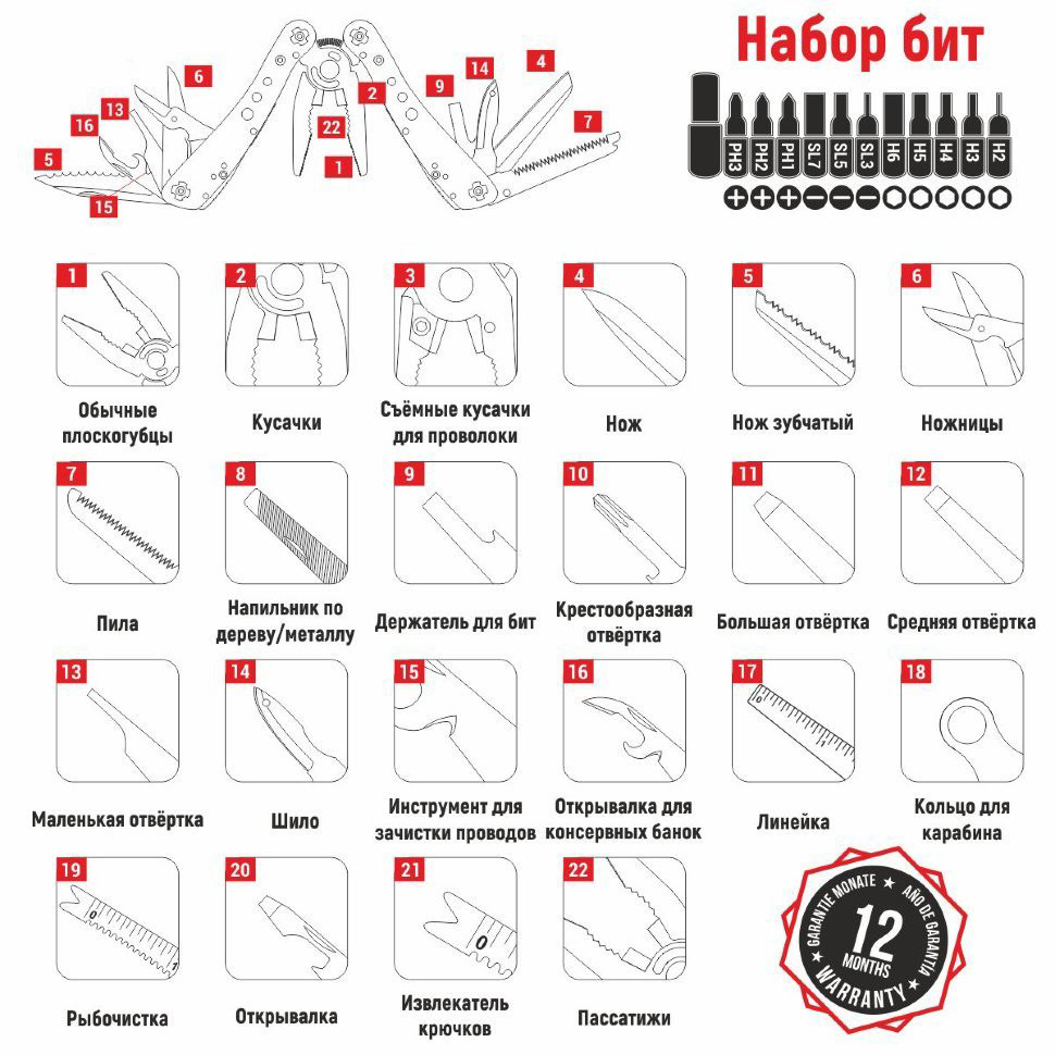 Мультитул Ganzo G201 стане прекрасним придбанням для туриста і просто активної людини. По суті, він представляє з себе справжню похідну майстерню. У невеликому корпусі інструменту полягає відразу 22 різних елементів, які допоможуть впоратися з найрізноманітнішими поломками і несправностями. В першу чергу, це плоскогубці з кусачками. Вони зроблені повнорозмірними, а тому впораються навіть зі значними навантаженнями. Решта ж інструменти зменшені, щоб їх можна було розмістити всередині рукояток мультитула. У перелік входять пила, звичайний ніж і лезо з хвилястим заточуванням, ножиці, дві викрутки з плоским шліцом різного розміру, відкривачка. Ще один інструмент-тримач для знімних викруток. Ці елементи зібрані в загальному органайзері, де знаходиться і магнітний перехідник. З їх допомогою ви легко впораєтеся з будь-якими болтами і шурупами.