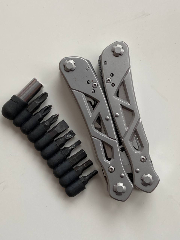 серрейтор (ніж з особливим видом заточування леза); відкривачка для пляшок; прилад для зачистки проводів; підпружинені Пасатижі; невелика викрутка (шлицевая); гострий ніж, ніж для відкривання консервів; ножиці, маленька пила; пристосування для захоплення гайок і циліндрів; кусачки, шило; комплект: тримач і 12 змінних біт-насадок. Особливість: