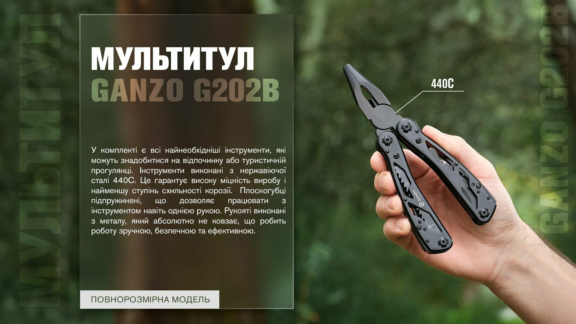 Китайський виробник Ganzo знаменитий своїми багатофункціональними мультитулами. Одним з таких є MultiTool Ganzo G202B, дуже стильний і функціональний варіант. G202B вважається повнорозмірним і об'єднує в собі 24 інструментів.