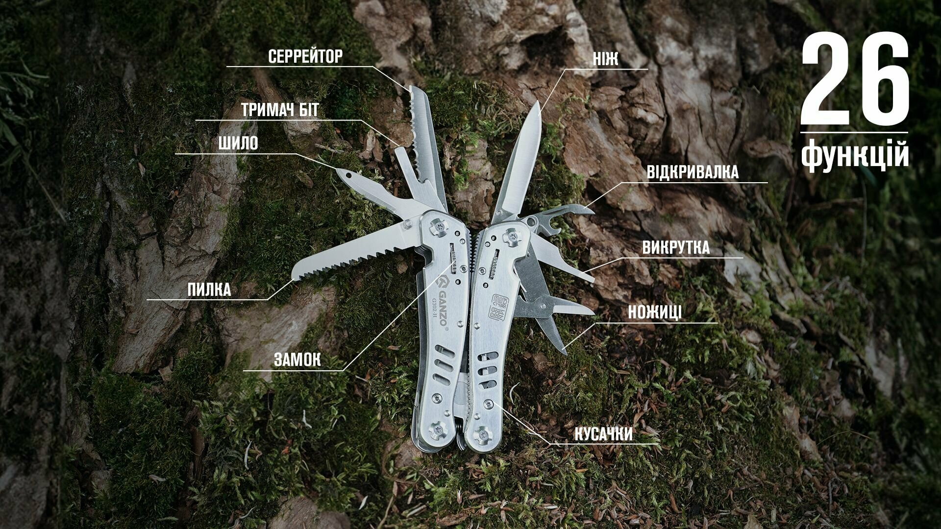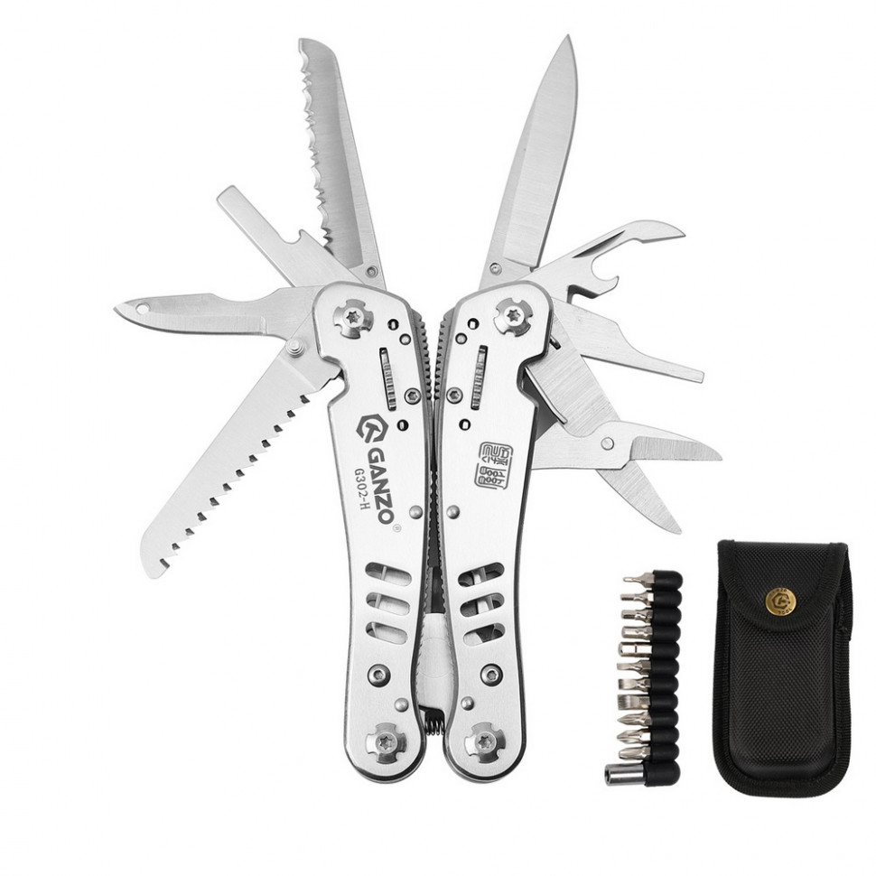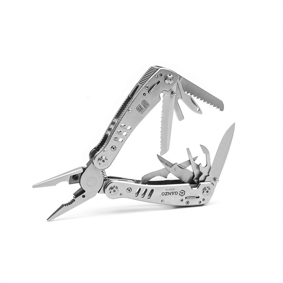 Ganzo G302-Н-це мультитул на основі вже відомої моделі від бренду Ganzo. Однак зміни торкнулися не тільки обробки металу, але і зовнішнього вигляду деяких інструментів. У підсумку, покупці отримали ще один прекрасний зразок практичного інструменту, користь якого кожен власник зможе оцінити на практиці. Всі інструменти, як і корпус мультитула Ganzo G302-Н, зроблені зі сталі 440С.це сплав високої якості, який відноситься до категорії нержавійок. Він цілком може використовуватися в умовах частого контакту з водою, які характерні для туристичних походів, поїздок на риболовлю і полювання. Мінімальний догляд за інструментом забезпечить йому довговічність і збереження зовнішніх якостей. Головний за принципом розташування інструмент мультитула-це плоскогубці. Вони також наділені функцією кусачок і можливістю міцного захоплення гайок, втулок та інших круглих в перерізі предметів. Решта інструментів розподілені між двома рукоятками мультитула і розміщені всередині них. Це два ножі (звичайний і серрейторний), пила, відкривачки для консервів і пляшок, ножиці, шило, невелика викрутка з прямим шліцом, Магнітний тримач для змінних біт, інструмент для зняття з проводів ізоляції. Разом з мультитулом продається і набір необхідних для роботи з різними гвинтами і шурупами викруток. Вони розміщені в одному загальному органайзері. Цей органайзер разом з мультитулом може зберігатися в одному нейлоновому чохлі.