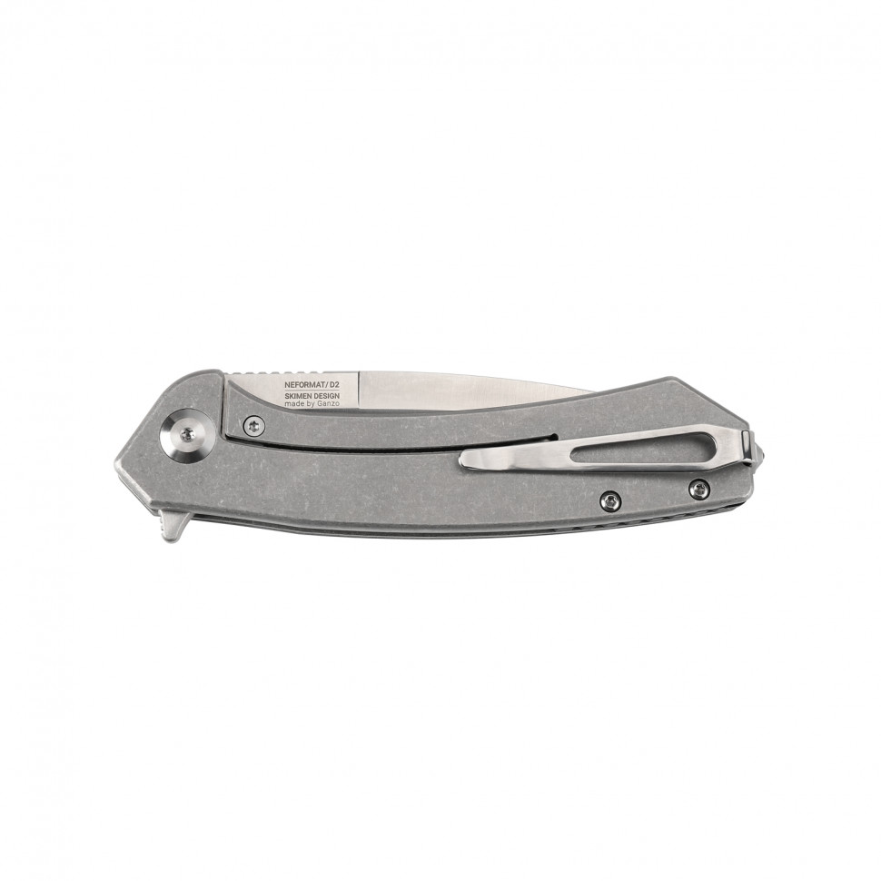 Воснові ножа-надміцна, зносостійкасталь марки D2. Захищений від корозіїметалевий сплав демонструєвисокі показники твердості. Значеннятвердості у ножа-близько 60 одиниць пошкалою Роквелла, що дуже добре дляданого виду продукції. Тип заточування –прямий. Довжина клинка становить вісімз половиною сантиметрів, товщина-триз половиною міліметра. Модель складна,лезо витягується за допомогою зручногозамку Flipper. Skimen надійним чином захищенийвід випадкового відкриття або закриття.Він безпечний в застосуванні, і маєпросту конструкцію. Загальна довжина виробувсього 20,5 сантиметра. Такі компактнігабарити дають перевагу ножу длязастосування кожен день. Його можназапросто покласти в сумку або кишеню,і застосовувати за необхідності, модельзавжди під рукою.