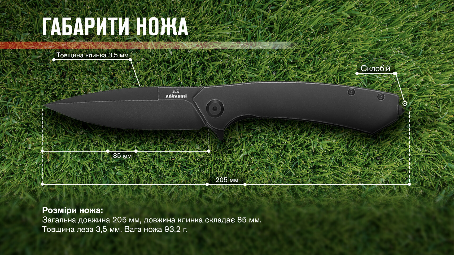 Дизайн складаного ножа з лінійки Adimanti розроблено українським ножовим майстром Русланом Скіменом. Модель належить до преміальних інструментів завдяки використаним висококласним матеріалам: мартенситної сталі CPM S35VN у клинку та титану в руківʼї. Клинок завдовжки 8.5 см виймається з руківʼя натисканням на фліпер. У відкритому положенні конструкція досягає 20.5 см у довжину. Ніж укомплектований кліпсою. Також є склобій у хвості руківʼя. Модель важить 92.3 г.