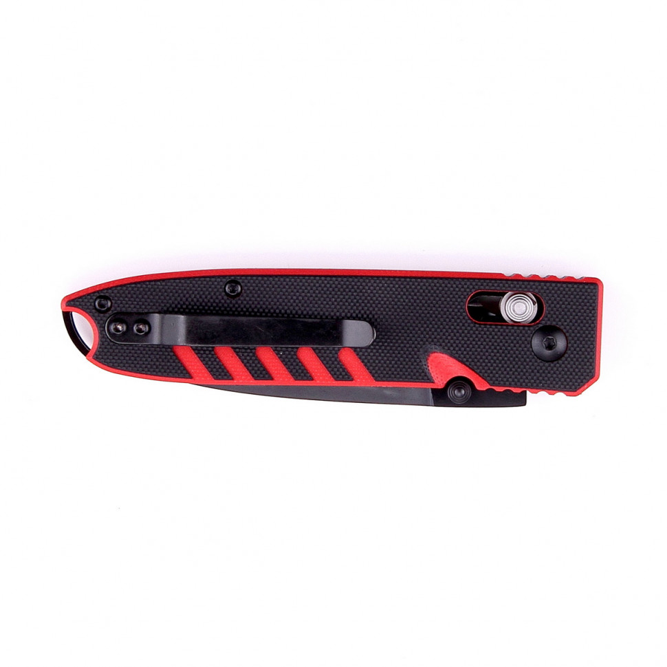 Для рукоятки виготовлені дві накладки з G10. Це сучасний різновид пластика, отримана в результаті з'єднання скловолокна і епоксидних смол. Матеріал-дуже міцний і стійкий до більшості негативних факторів. До того ж, склопластик не складно пофарбувати. Тому покупцям пропонується ніж з рукояткою, в якій скомбіновані елементи червоного і чорного кольору. Також, до рукоятки прикручена кліпса, щоб фіксувати ніж в кишені або на ремені.