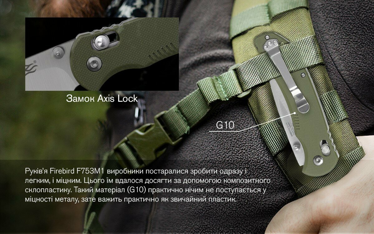 Ніж Firebird F753M1 виготовлений таким чином, щоб задовольнити запити відразу великого числа покупців. Він підходить для всіх видів туризму та інших різновидів активності на природі. Його так само успішно можна використовувати і в місті. Дана модель зроблена складаний, що істотно полегшує її перевезення. Більш того, вбудований в ніж замок, надійно блокує хід леза по осі, щоб воно не могло переміщатися самостійно при використанні ножа. В даному випадку, це замок Axis, що дозволяє легко відкривати ніж в разі потреби однією рукою.