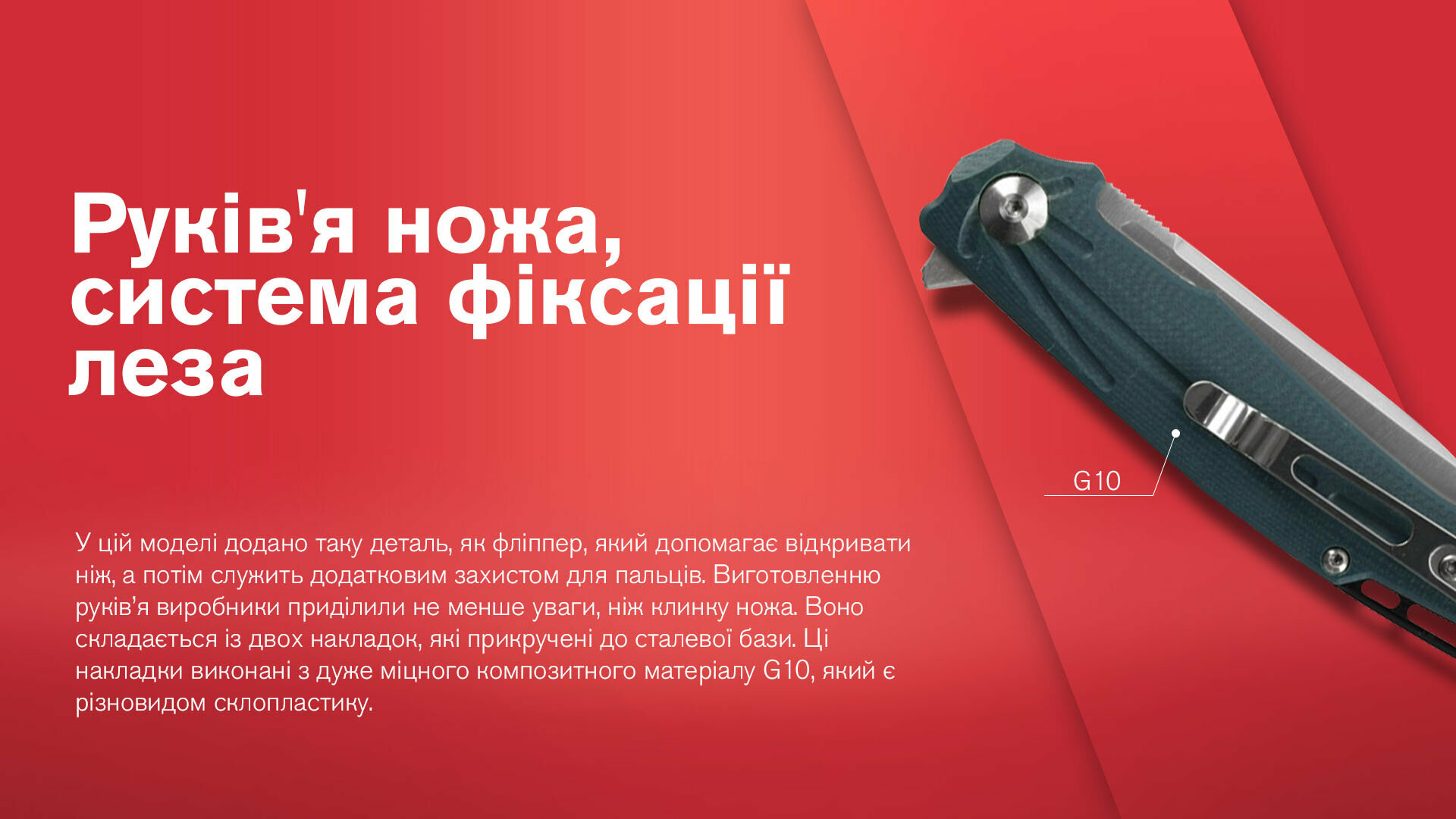 Довжина клинка даної моделі дорівнює 86 мм. А ось товщина по обуху складає цілих 3,5 мм. Так що ніж підійде і для використання в польовій кухні, і для більш серйозних видів робіт. Форма його леза-це Droppoint: трохи знижена лінія обуха і добре збалансоване вістря. Ніж отримав заточку типу plain-гладку по всій довжині. На фінішній стадії обробки клинок пройшов шліфування шляхом сатинування. У даній моделі додана така деталь, як фліппер, який допомагає відкривати ніж, а потім служить додатковим захистом для пальців.