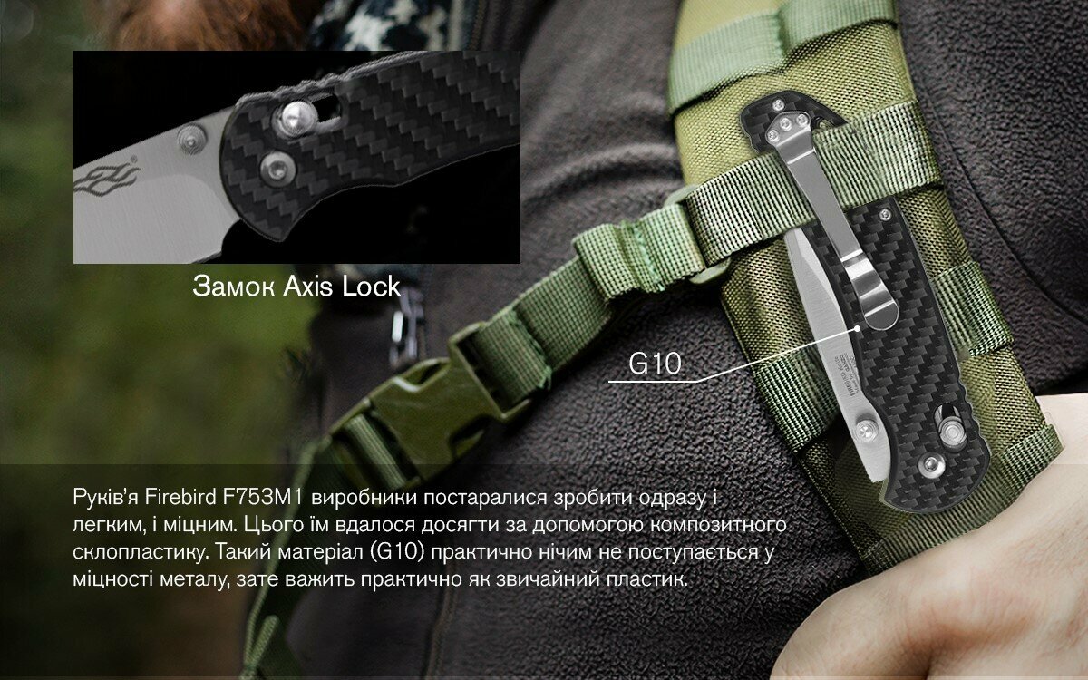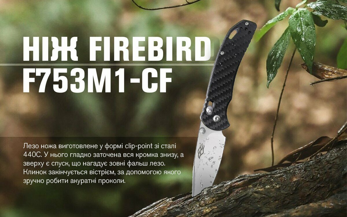 Ніж Firebird F753M1-CF виготовлений таким чином, щоб задовольнити запити відразу великого числа покупців. Він підходить для всіх видів туризму та інших різновидів активності на природі. Його так само успішно можна використовувати і в місті. Дана модель зроблена складаний, що істотно полегшує її перевезення. Більш того, вбудований в ніж замок, надійно блокує хід леза по осі, щоб воно не могло переміщатися самостійно при використанні ножа. В даному випадку, це замок Axis, що дозволяє легко відкривати ніж в разі потреби однією рукою.
