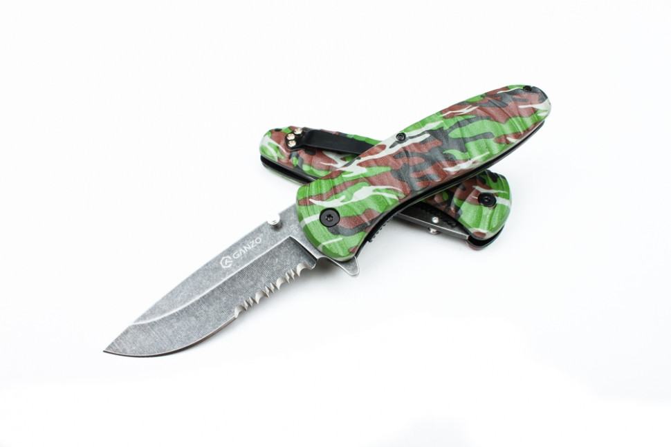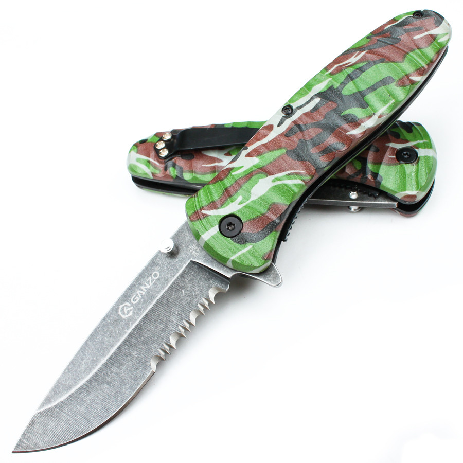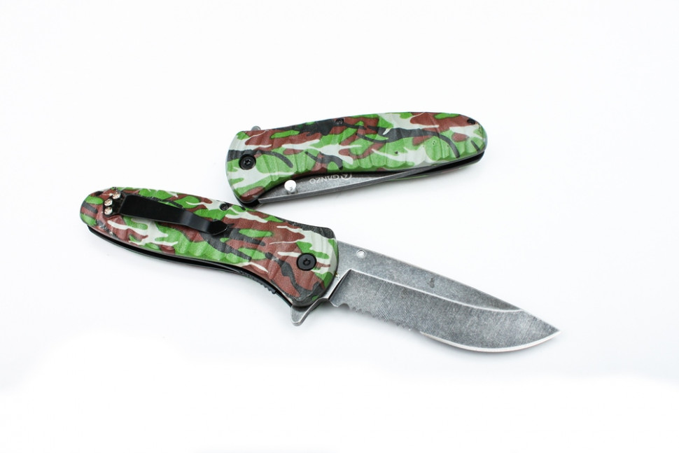 Наявність камуфляжного забарвлення рукоятки (в даному випадку-зеленого кольору) вигідно відрізняє цю модель від інших подібних. Довжина ножа в складеному вигляді становить 115 мм, а в робочому стані на 100 мм більше.