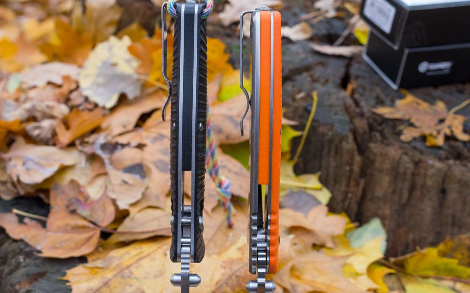 Для ручки ножа виробники вибрали все ту ж нержавіючу сталь, а також сучасний різновид склопластику - G10. Він відноситься до композитних матеріалів з високою міцністю і здатністю протистояти основним видам корозії. Покупці можуть вибирати ножі з накладками трьох різних кольорів: класичного чорного, зеленого або оранжевого. Зі зворотного боку ручки розташована металева сталева кліпса для закріплення ножа в кишені або на поясі.