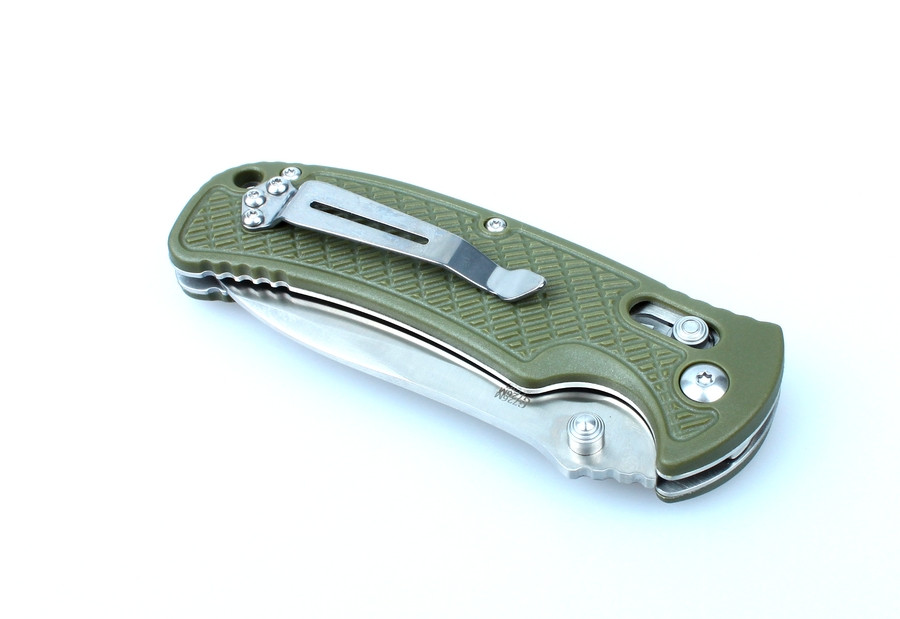 Основу рукоятки фахівці компанії Ganzo виготовили з тієї ж сталі, що і клинок ножа. Але з обох сторін на неї накладені елементи з армованого скловолокном нейлону. Це дуже міцний і довговічний матеріал, стійкий до більшості видів корозії. Він не сильно гріється на сонці і не переохолоджується на морозі. Тому тримати ніж в руці буде комфортно в будь-який час року. А щоб ніж не вислизав з вологих долонь, накладки на рукоятці рифлені. Покупцям доступні три варіанти кольору ножа Ganzo 726m: Чорний, темно-зелений і яскравий помаранчевий. До речі, на рукоятці є кліпса-прищіпка, щоб ніж можна було пристебнути до кишені.