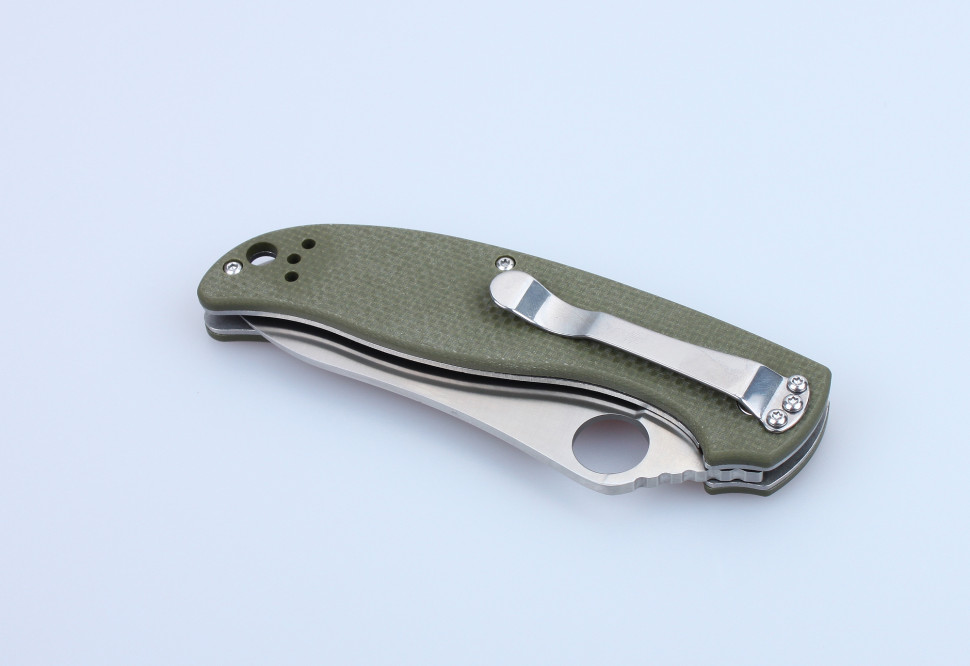 Щоб ніж було зручно тримати, а його зовнішній вигляд був привабливим, на рукоятці зроблені накладки з G10. Це композитний матеріал, що представляє собою з'єднання епоксидних смол зі скловолокном. Він дуже міцний і стійкий до корозії, легко формується і довгий час зберігає початкові характеристики. Оскільки склопластик легко забарвлюється, виробники запропонували покупцям чотири варіанти ножів Ganzo G734 з рукоятками різного кольору. Це болотно-зелений, чорний, яскравий помаранчевий і камуфляжний.Особливість: