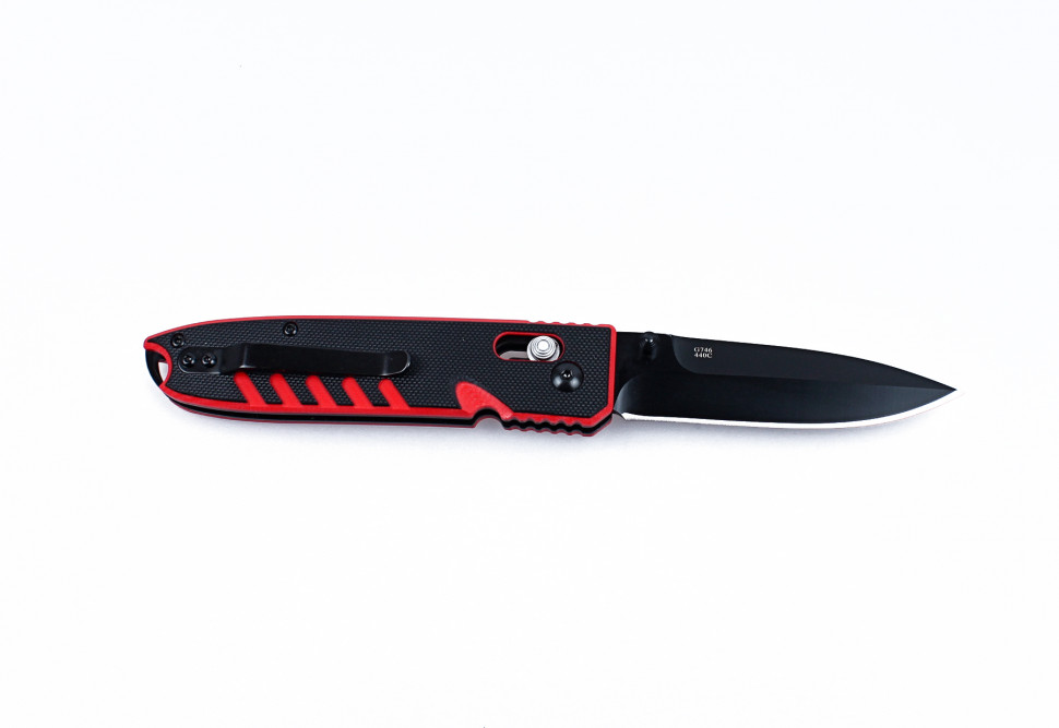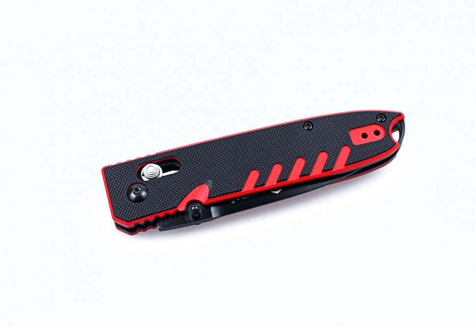 В основі рукоятки ножа G746-3-RB також лежить сталь. Але метал з обох сторін прикритий накладками з композитного різновиду пластику-G10. Це робить ручку ножа більш комфортною: з ергономічними формами і несприйнятливістю до перепадів температур. Що стосується міцності, то G10 майже не поступається сталі. Рукоятка прикрашена дрібною накаткою, і до неї прикріплена кліпса для страховки ножа від випадкової втрати. Окремі елементи ручки пофарбовані в червоний колір, інші-в чорний.
