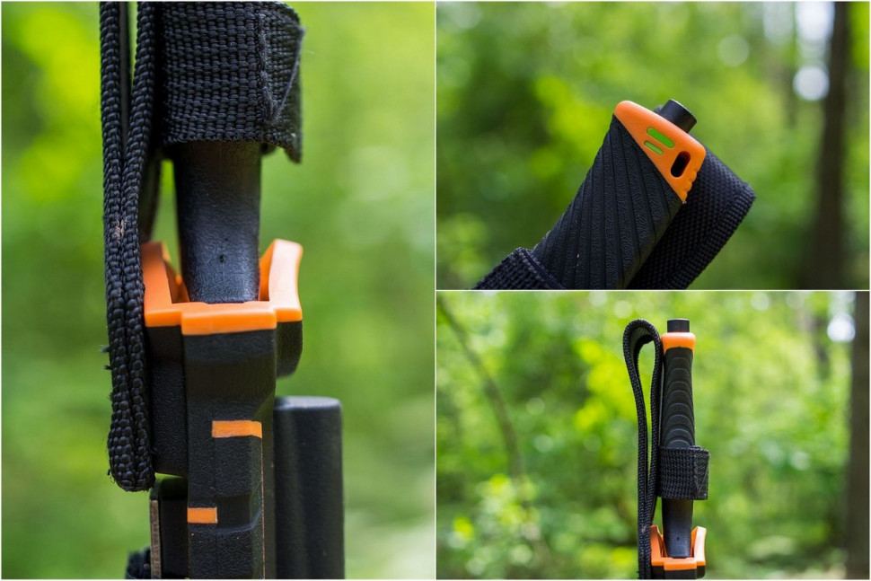 Рукоятка виготовлена з пластику ABS. Він відноситься до групи термопластиків, які відомі міцністю і довговічністю. Рукоятка в даній моделі може комбінувати елементи чорного і оранжевого кольору, або чорного і зеленого. У цих же відтінках виконаний і чохол для ножа. Він зроблений з нейлону і пластика, а ніж утримує всередині за допомогою застібки-липучки. Зі зворотного боку чохла вбудована компактна металева пластина з алмазним напиленням, яка є практичною і легкою точилкою для рівної ділянки леза. Крім того, в чохол вбудований стропоріз, а в спеціальному гнізді закріплено виймається кресало. На додаток до цього, рукоятка ножа закінчується невеликим плоским виступом, що виконує роль склобою.