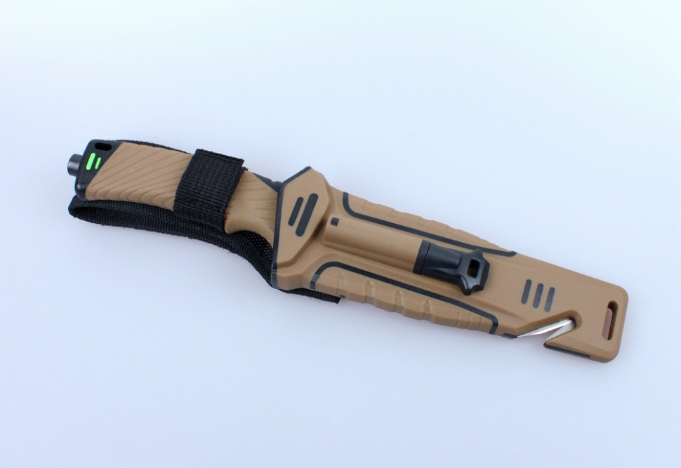 Рукоятка виготовлена з пластику ABS. Він відноситься до групи термопластиків, які відомі міцністю і довговічністю. Рукоятка в даній моделі може комбінувати елементи чорного і оранжевого кольору, або чорного і зеленого. У цих же відтінках виконаний і чохол для ножа. Він зроблений з нейлону і пластика, а ніж утримує всередині за допомогою застібки-липучки. Зі зворотного боку чохла вбудована компактна металева пластина з алмазним напиленням, яка є практичною і легкою точилкою для рівної ділянки леза. Крім того, в чохол вбудований стропоріз, а в спеціальному гнізді закріплено виймається кресало. На додаток до цього, рукоятка ножа закінчується невеликим плоским виступом, що виконує роль склобою.