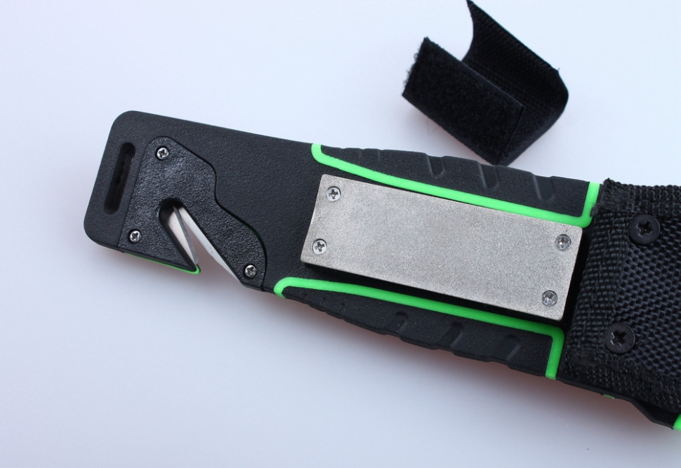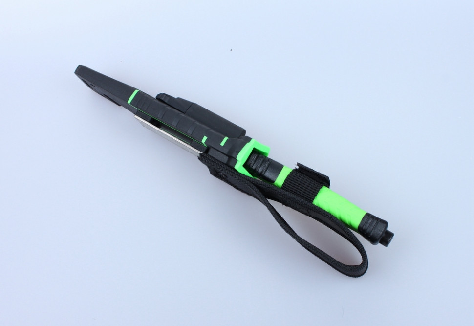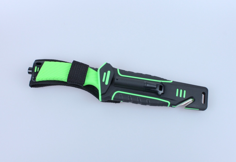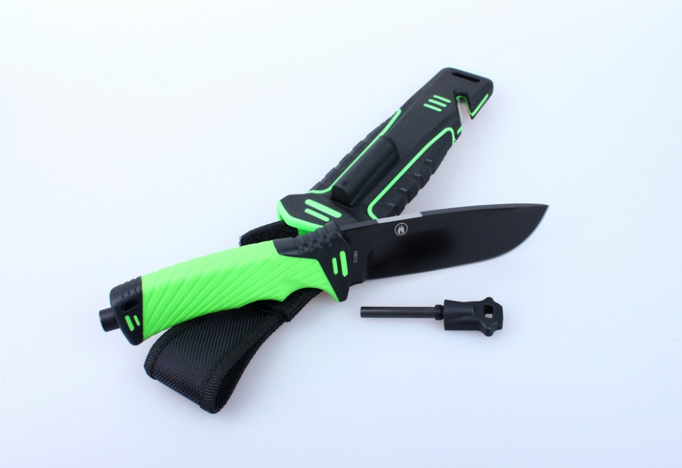 Рукоятка виготовлена з пластику ABS. Він відноситься до групи термопластиків, які відомі міцністю і довговічністю. Рукоятка в даній моделі може комбінувати елементи чорного і оранжевого кольору, або чорного і зеленого. У цих же відтінках виконаний і чохол для ножа. Він зроблений з нейлону і пластика, а ніж утримує всередині за допомогою застібки-липучки. Зі зворотного боку чохла вбудована компактна металева пластина з алмазним напиленням, яка є практичною і легкою точилкою для рівної ділянки леза. Крім того, в чохол вбудований стропоріз, а в спеціальному гнізді закріплено виймається кресало. На додаток до цього, рукоятка ножа закінчується невеликим плоским виступом, що виконує роль склобою.