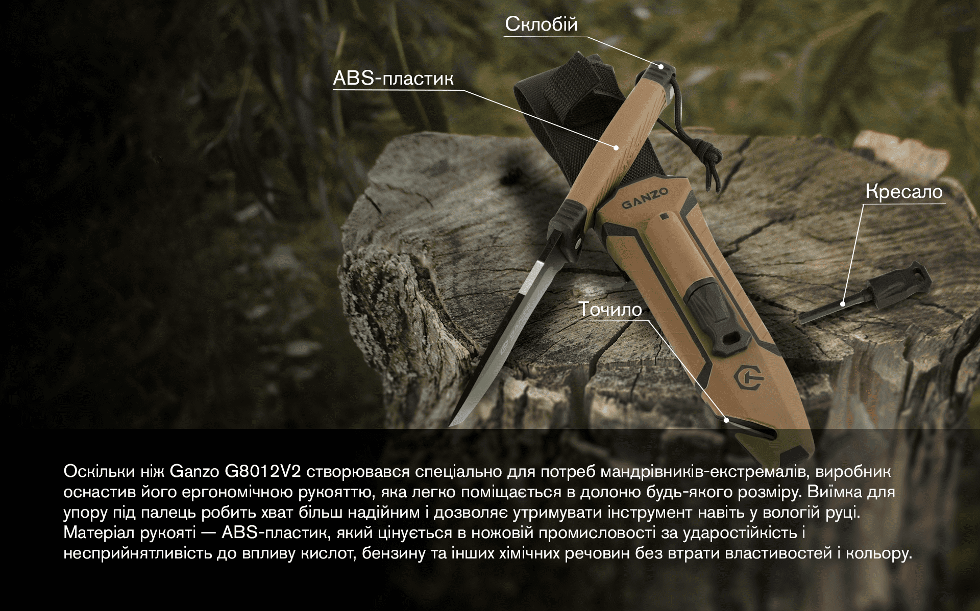 Оскільки ніж Ganzo G8012V2-DY створювався спеціально для потреб мандрівників-екстремалів, виробник оснастив його ергономічною рукояттю, яка легко поміщається в долоню будь-якого розміру. Виїмка для упору під палець робить хват більш надійним і дозволяє утримувати інструмент навіть у вологій руці. Матеріал рукояті — ABS-пластик, який цінується в ножовій промисловості за ударостійкість і несприйнятливість до впливу кислот, бензину та інших хімічних речовин без втрати властивостей і кольору.