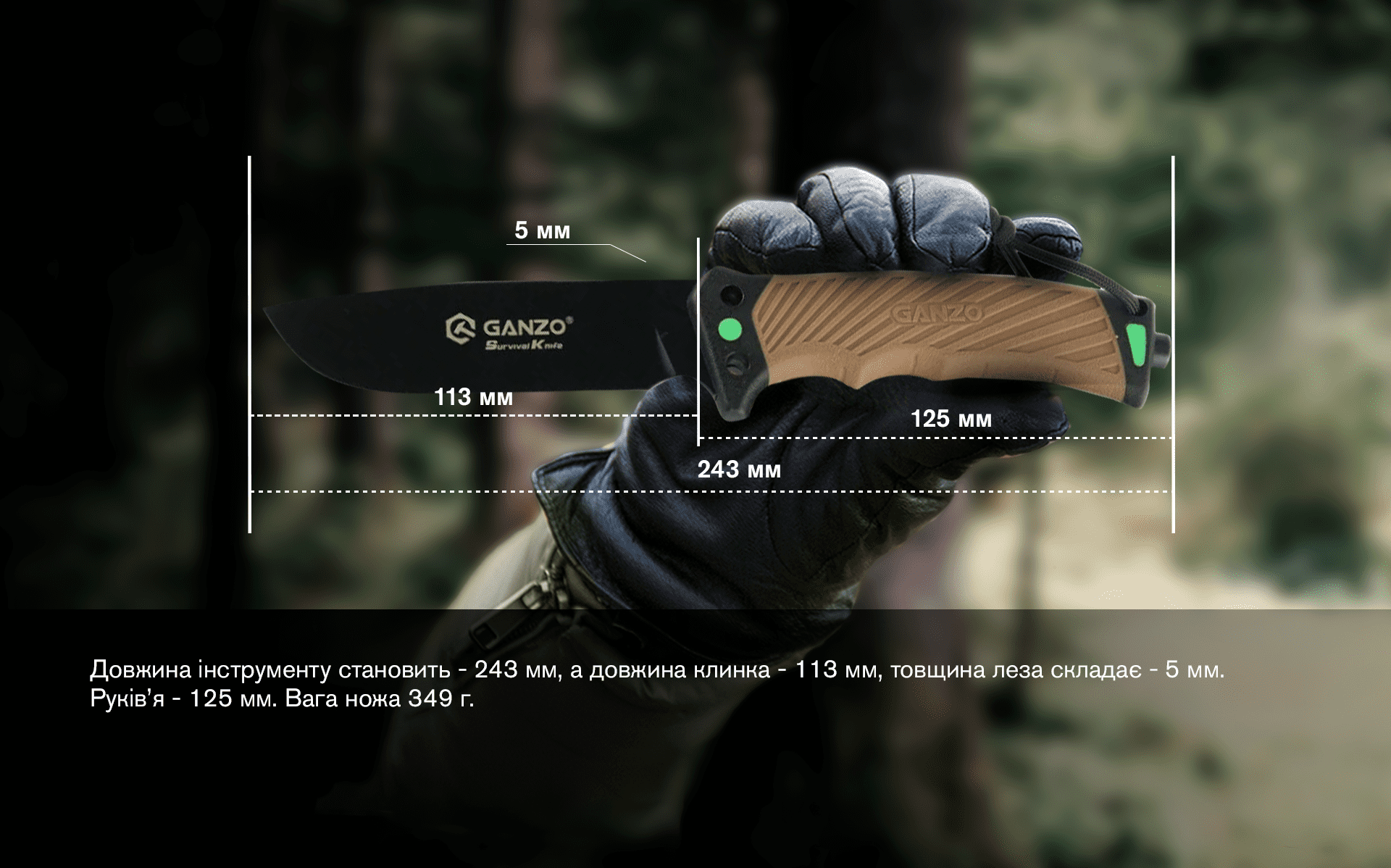 У комплект з ножем входять фірмові піхви, які мають доповнення у вигляді невеликого кресала, стропоріза і компактної пластини, що виконує функцію Точила, якщо під рукою немає повноцінного точильного каменю. Модель Ganzo G8012V2-DY має отвір під темляк і продається разом з паракордом. Це синтетична мотузка з особливим плетінням, яке підвищує міцність матеріалу. Темляк можна використовувати як додатковий варіант для фіксації вироби на поясі або сумці.