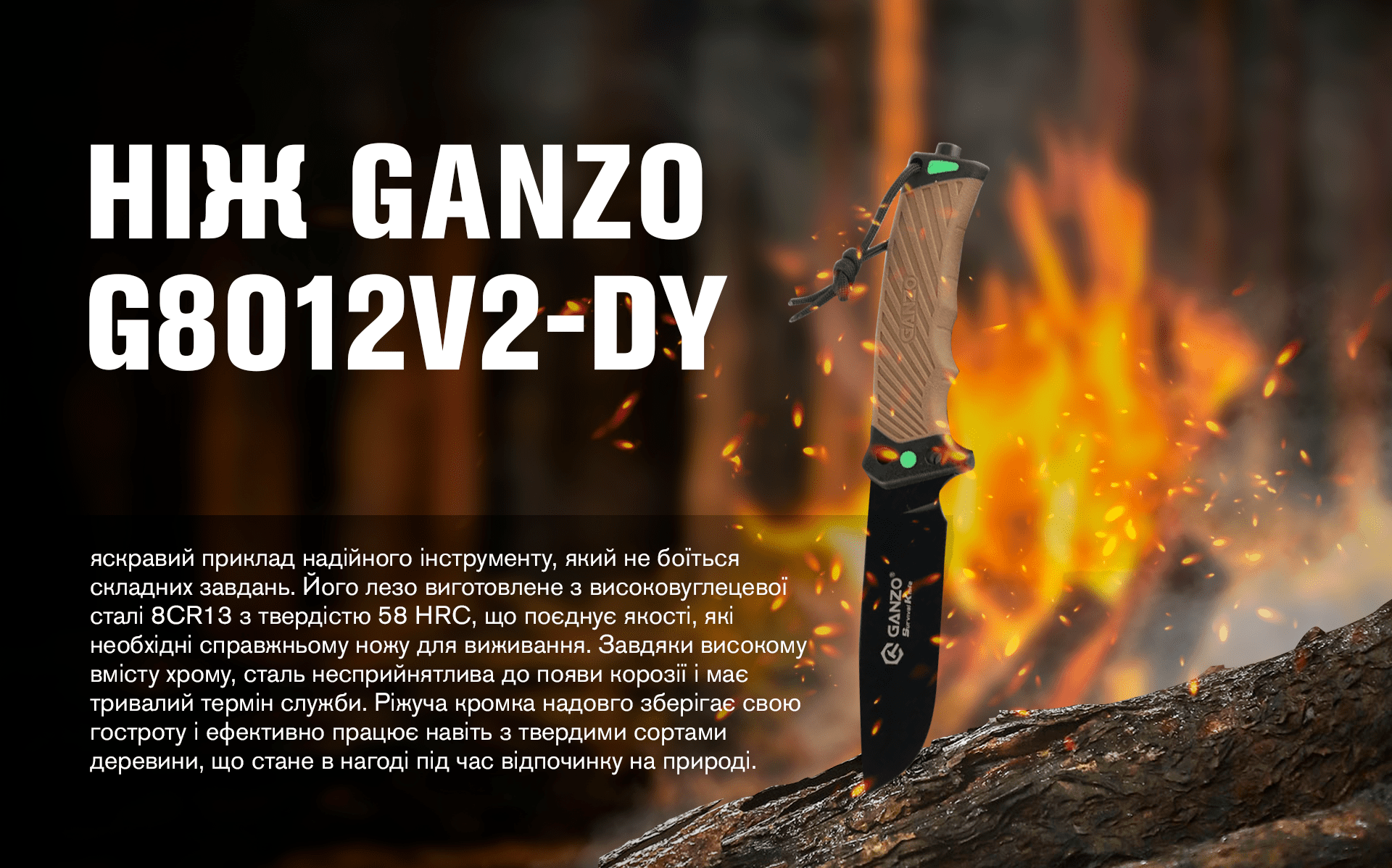 Виробник позиціонує модель Ganzo G8012V2-DY як ніж виживальника, оскільки вона має посилену конструкцію, яка витримує екстремально високі навантаження. Інструмент відноситься до нескладного типу ножів. Клинок переноситься і зберігається в спеціальних піхвах, які мають ряд додаткових функцій.