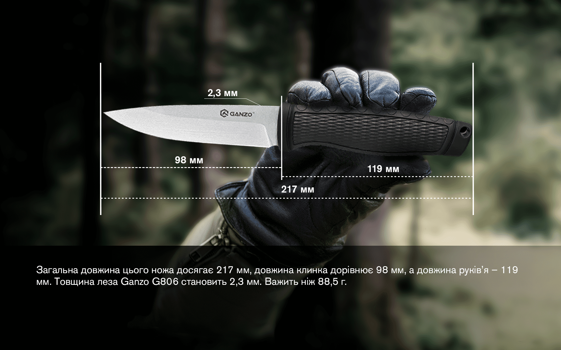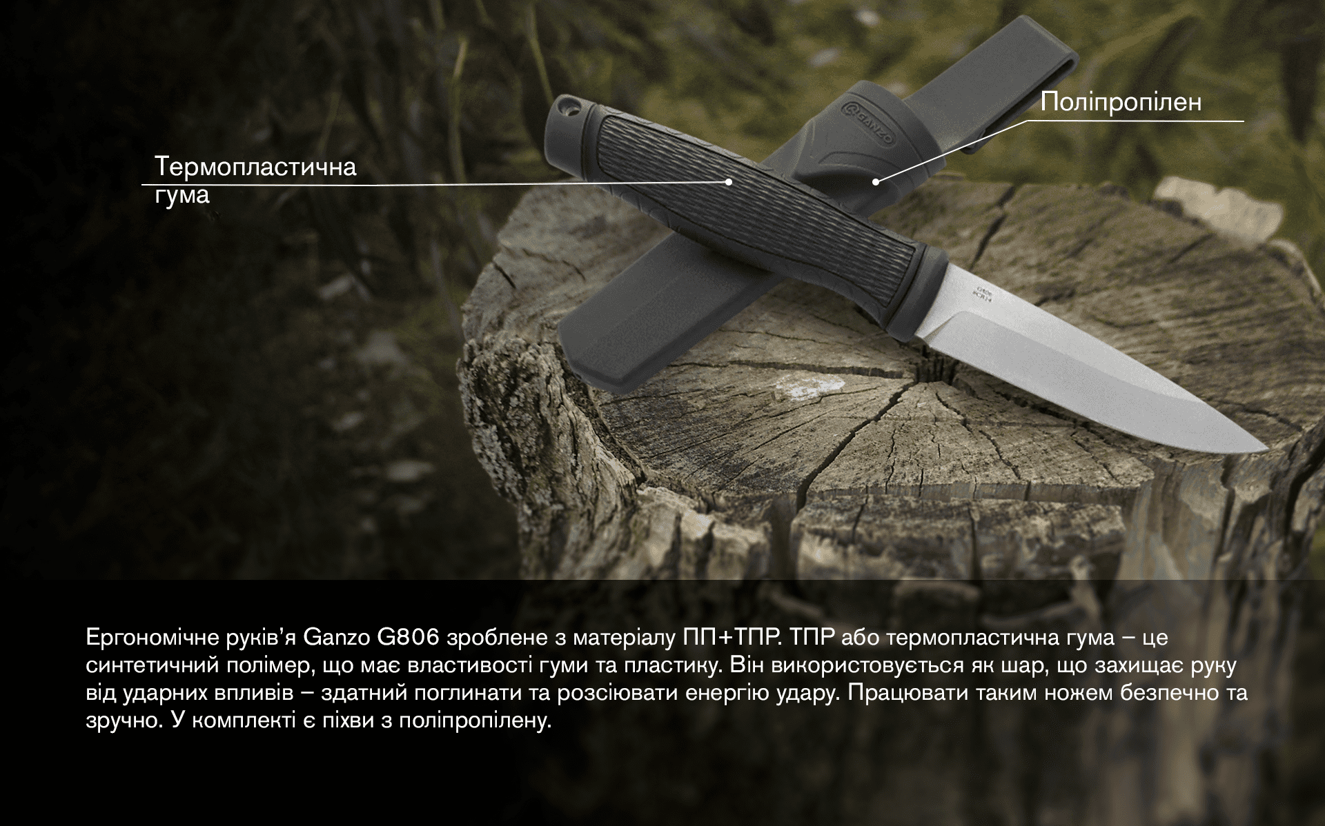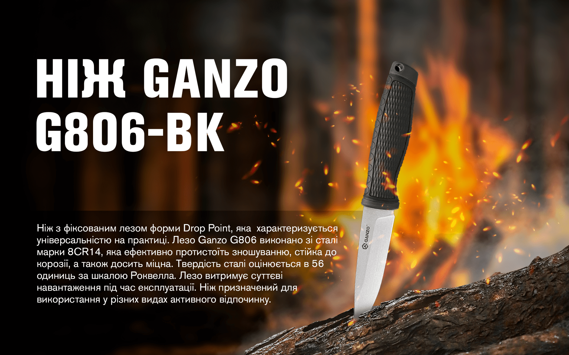 Ніж моделі Ganzo G806 є інструментом з фіксованим лезом форми Drop Point, що характеризується універсальністю на практиці. Це добротна модель, якою однаково зручно буде виконувати як колючі, так і ріжучі операції. Ніж призначений для використання у різних видах активного відпочинку. Стане в нагоді туристам, мисливцям, рибалкам, виживачам, усім любителям активного проведення часу на відкритому повітрі.
