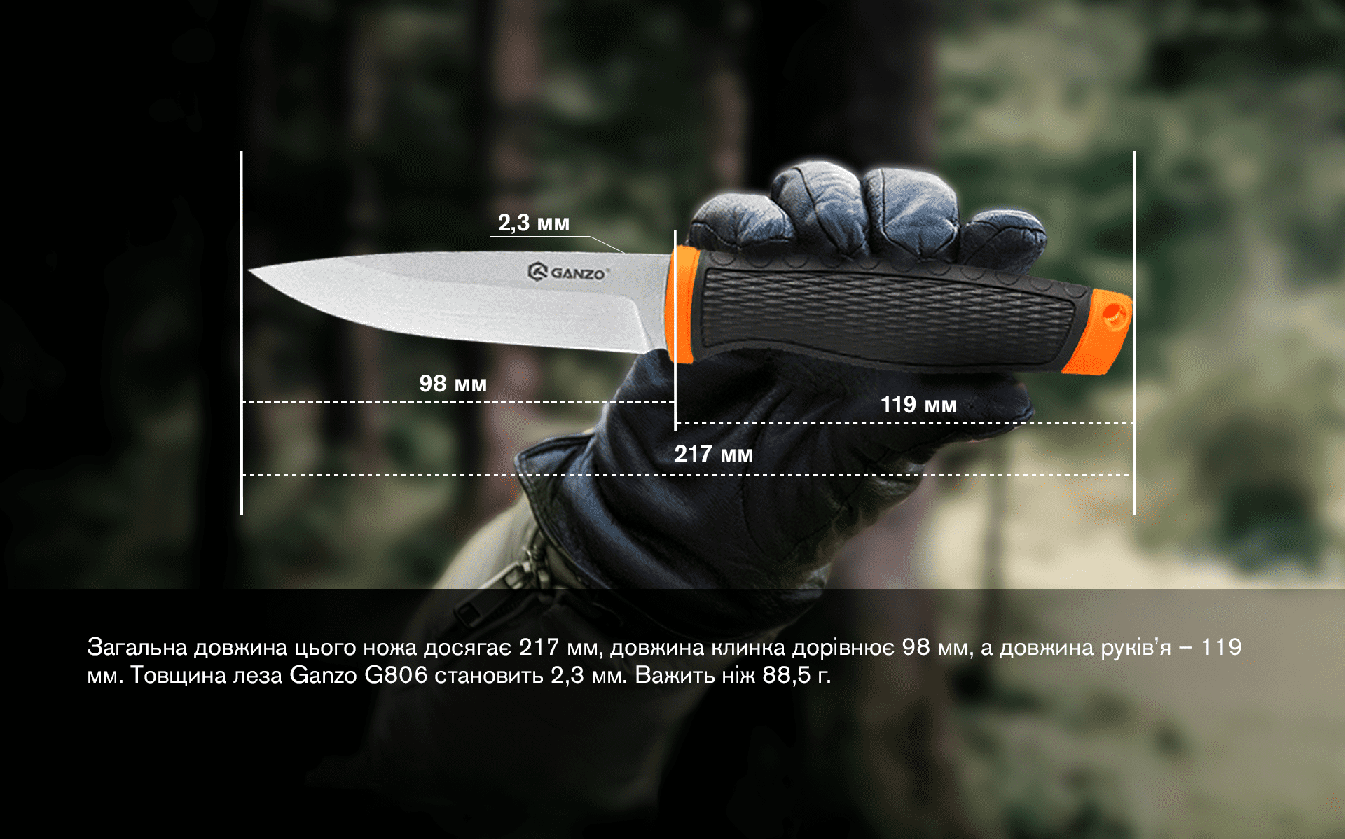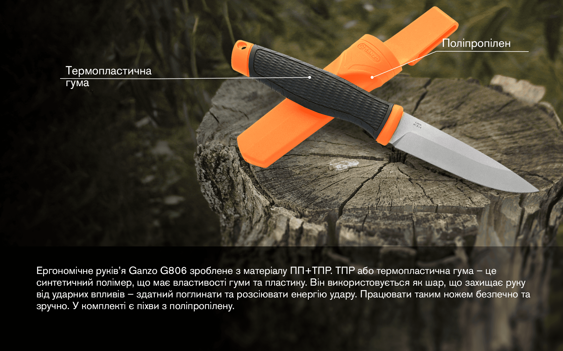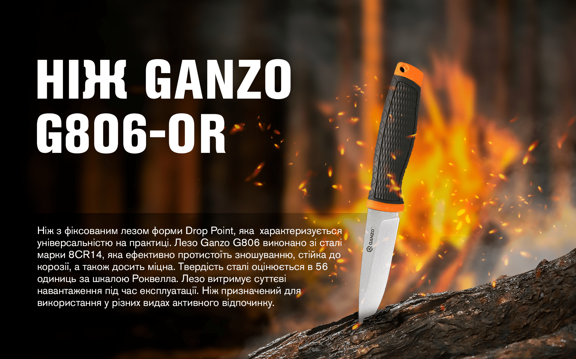 Ніж моделі Ganzo G806 є інструментом з фіксованим лезом форми Drop Point, яка характеризується універсальністю на практиці. Це добротна модель, якій однаково зручно буде виконувати як колючі, так і ріжучі, операції. Ніж призначений для використання в різних видах активного відпочинку. Стане в нагоді туристам, мисливцям, рибалкам, виживальщикам, всім любителям активного проведення часу на відкритому повітрі.