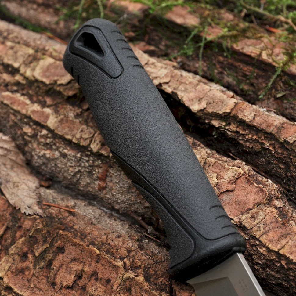 Трикутний отвір у хвості руківʼя органічно доповнює загальний дизайн конструкції. Отвір призначений для кріплення темляка, який накидається на руку під час використання ножа як підстрахування.