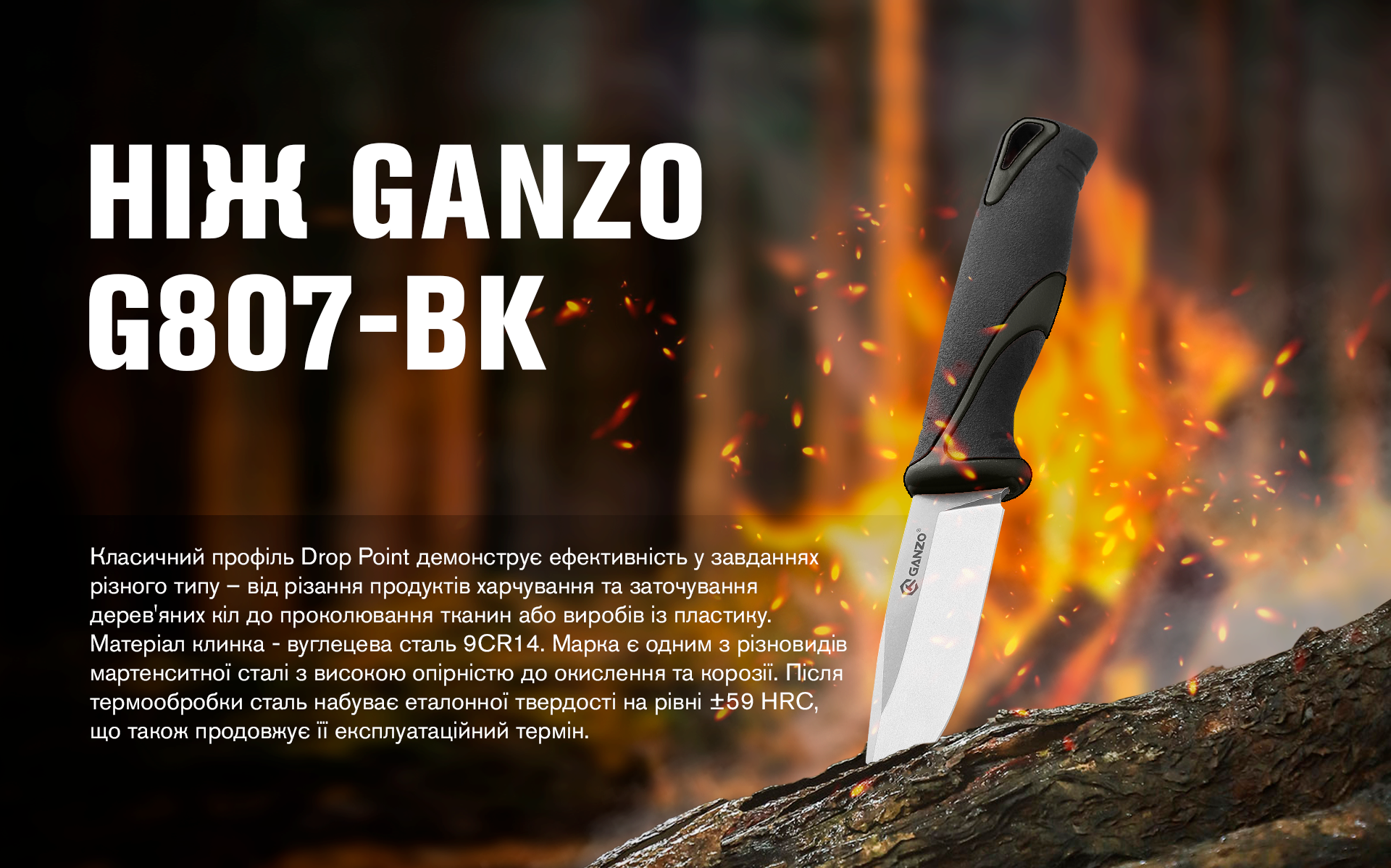 Модель Ganzo G807 — яскравий представник фіксованих ножів широкого призначення. Довжина її клинка дорівнює 88 мм, а товщина — 3.3 мм, що підвищує стійкість ножа до зношування. Клинок виготовлений із вуглецевої сталі 9CR14 твердістю порядку ±59 HRC, а матеріалом руківʼя завдовжки 115 мм виступають PP+TPR. Інструмент важить 96 г. Попри довжину конструкції, що дорівнює 205 мм, ніж є зручним у носінні — для цього в комплект включені піхви з PP.