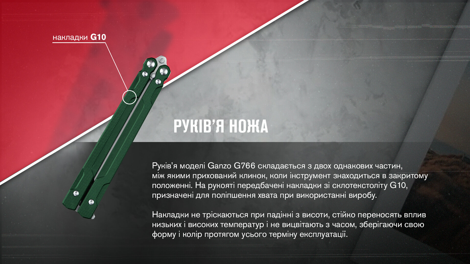 Модель G766-Перший ніж-метелик в асортименті компанії, що відрізняється від більшості аналогічних інструментів інших виробників своєю надлегкою вагою і зручністю у використанні. Балісонг від Ganzo - це переплетення вікових традицій з вироблення ножів-метеликів і особистих винаходів компанії, яка зробила з цього стильного аксесуара надійний і ефективний інструмент для сучасного користувача.