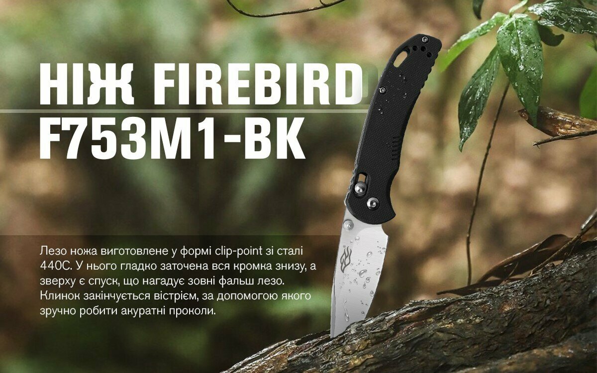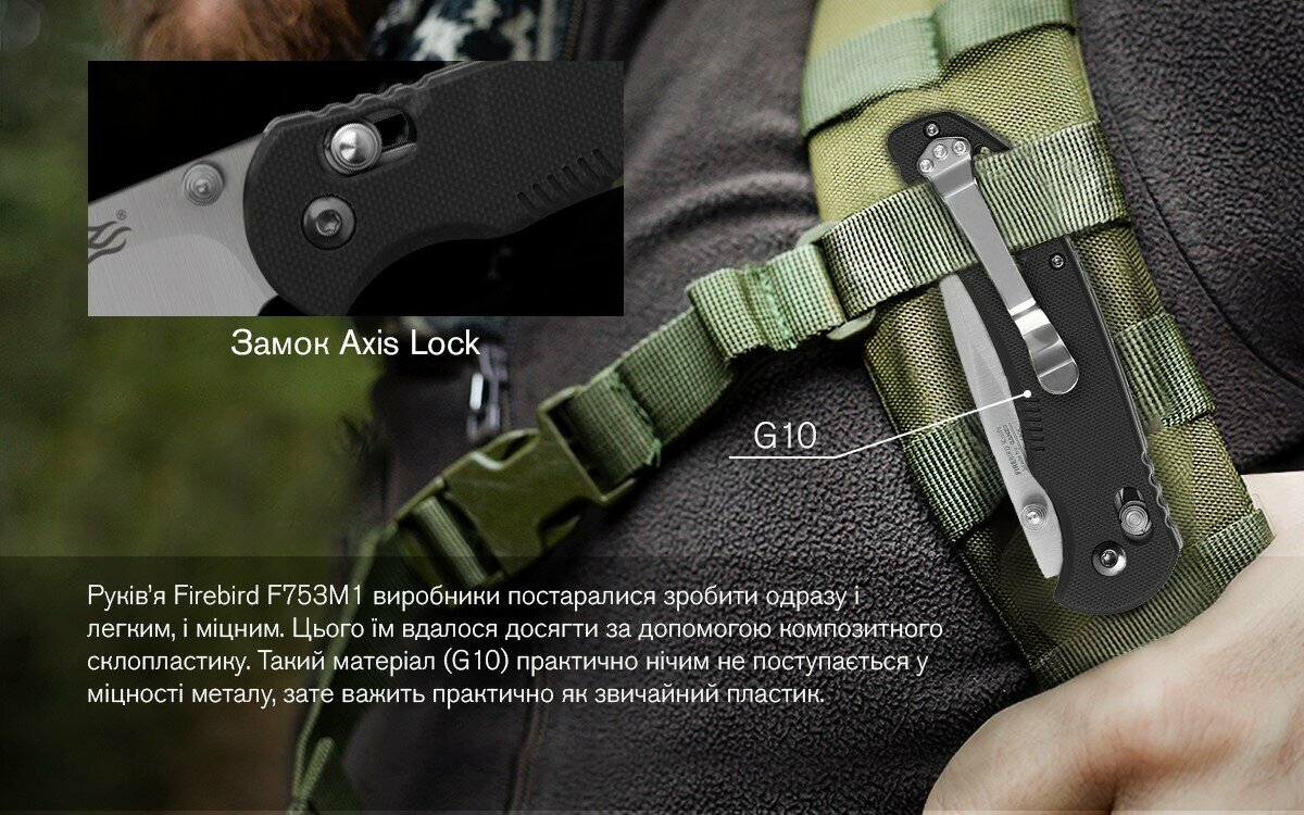 Ніж Firebird F753M1 виготовлений таким чином, щоб задовольнити запити відразу великого числа покупців. Він підходить для всіх видів туризму та інших різновидів активності на природі. Його так само успішно можна використовувати і в місті. Дана модель зроблена складаний, що істотно полегшує її перевезення. Більш того, вбудований в ніж замок, надійно блокує хід леза по осі, щоб воно не могло переміщатися самостійно при використанні ножа. В даному випадку, це замок Axis, що дозволяє легко відкривати ніж в разі потреби однією рукою.