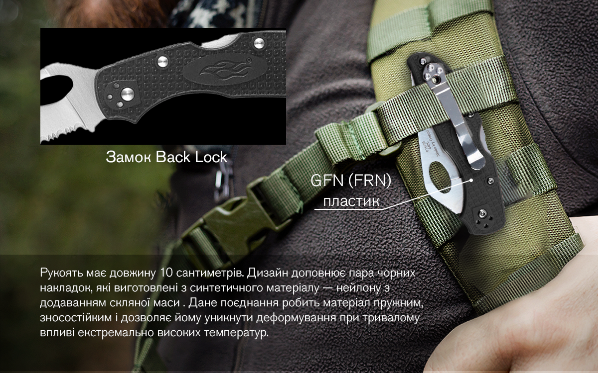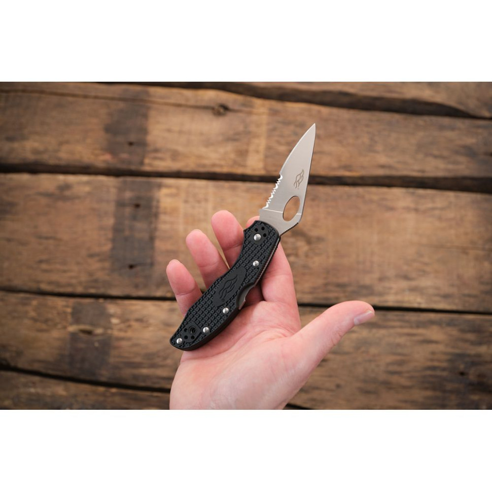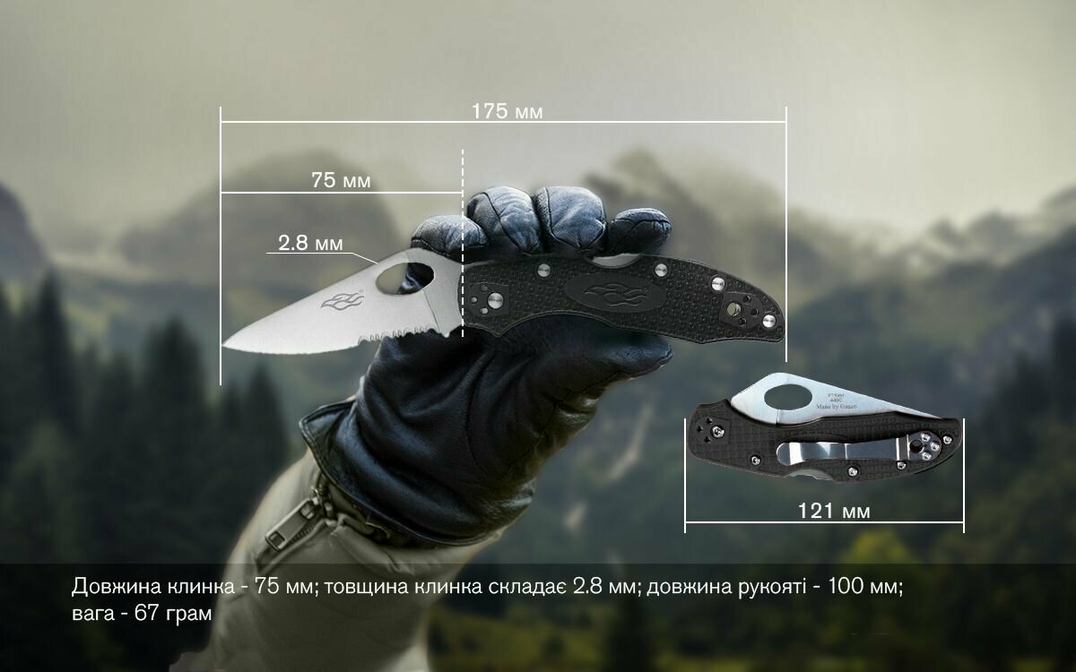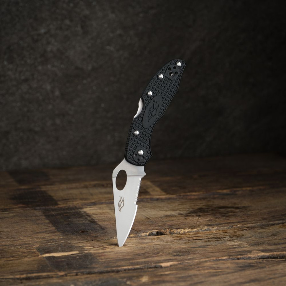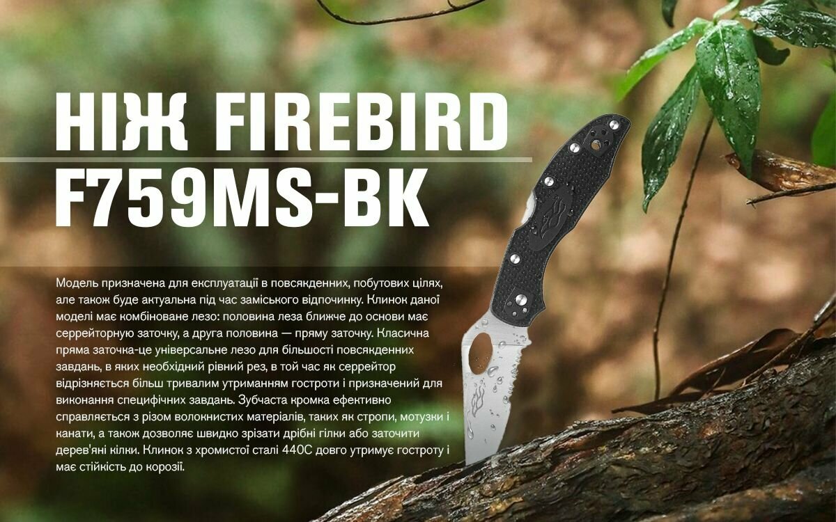 Мініатюрний ніж F759MS торгової марки Firebird оснащений комбінованим лезом для виконання завдань широкого спектру. Клинок з хромистої сталі 440С довго утримує гостроту і має стійкість до корозії. У моделі присутній замок Back Lock. Конструкція довжиною 10 сантиметрів в складеному вигляді важить 67 грам.