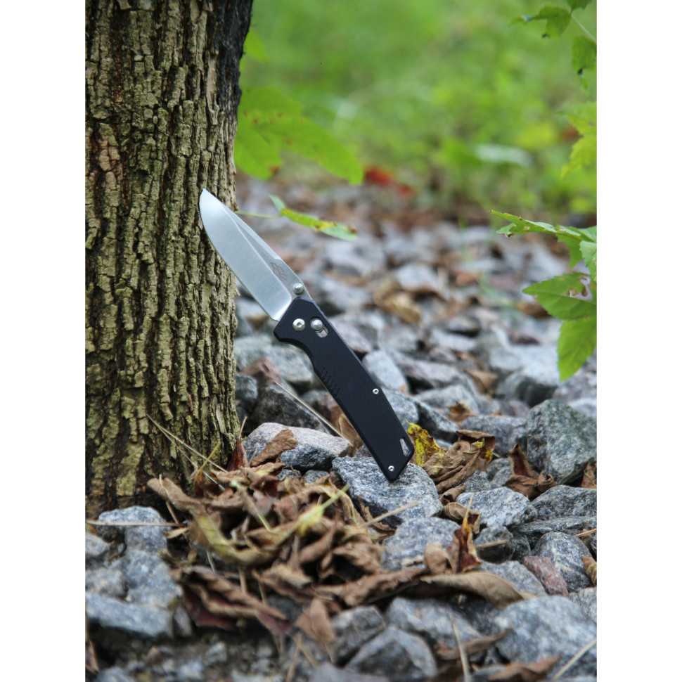 Відкривається лезо ножа за допомогою шпеньки, закріпленого ближче до обуху біля основи клинка. А в робочому положенні воно утримується якісним штифтовим замком Axis Lock.