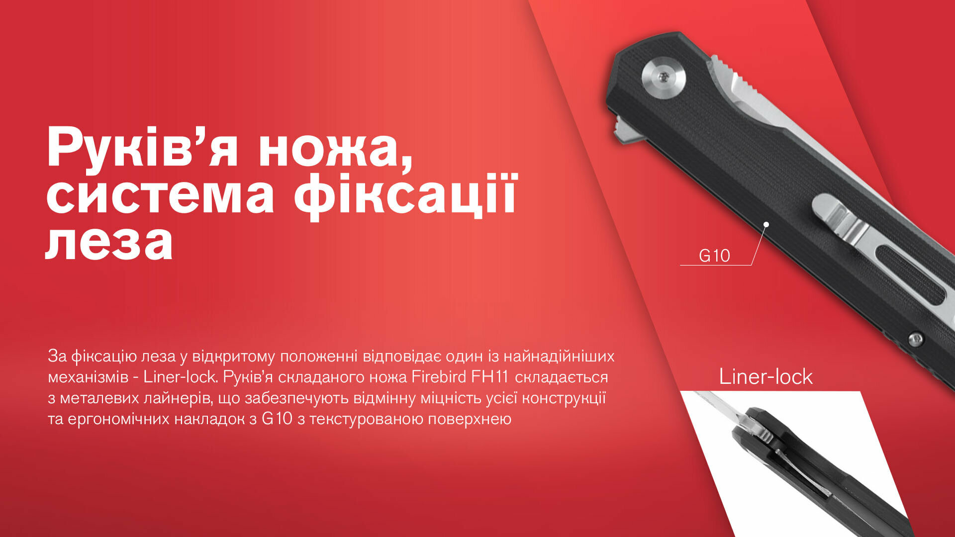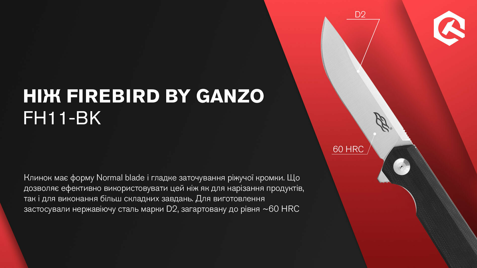 Ключовою перевагою складного ножа Firebird FH11 є простота, з якої в свою чергу слідують надійність і легкість у використанні. За рахунок гранично простої конструкції і застосування першокласних матеріалів, цей ніж здатний витримати досить суворі умови експлуатації. Таким чином, він підходить як для повсякденного носіння, так і для активного відпочинку на природі.