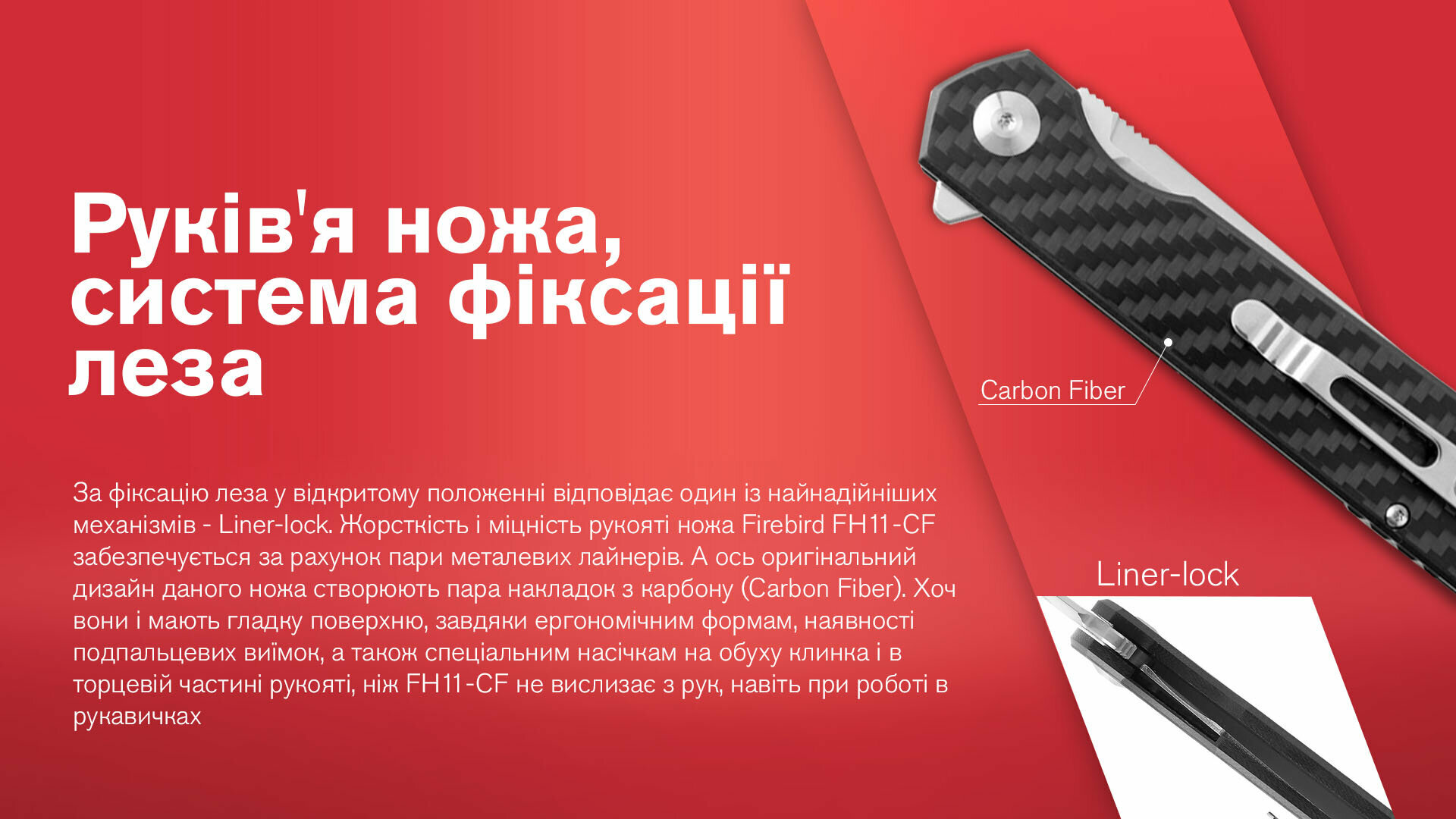 Жорсткість і міцність рукояті ножа Firebird FH11-CF забезпечується за рахунок пари металевих лайнерів. А ось оригінальний дизайн даного ножа створюють пара накладок з двох сторін із зносостійкого матеріалу G10 та зовнішнім шаром вуглецевого волокна (Carbon Fiber). Хоч вони і мають гладку поверхню, завдяки ергономічним формам, наявності подпальцевих виїмок, а також спеціальним насічкам на обуху клинка і в торцевій частині рукояті, ніж FH11-CF не вислизає з рук, навіть при роботі в рукавичках.