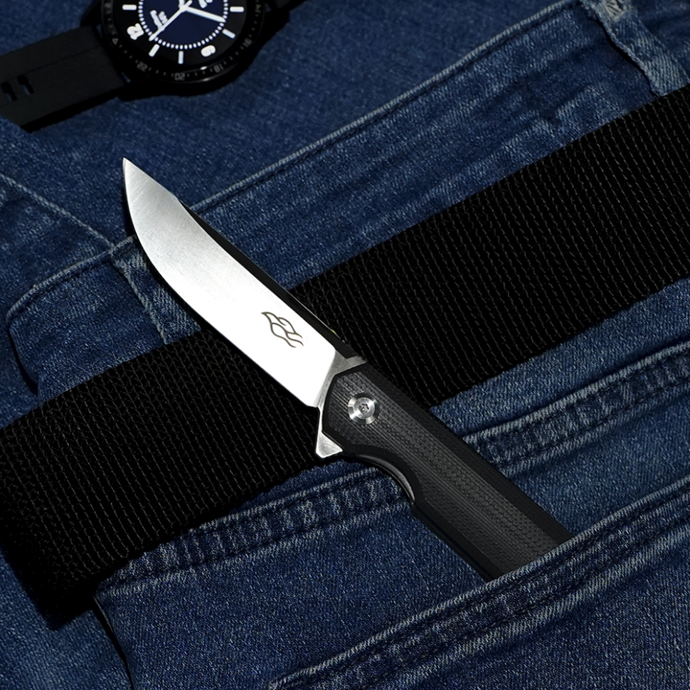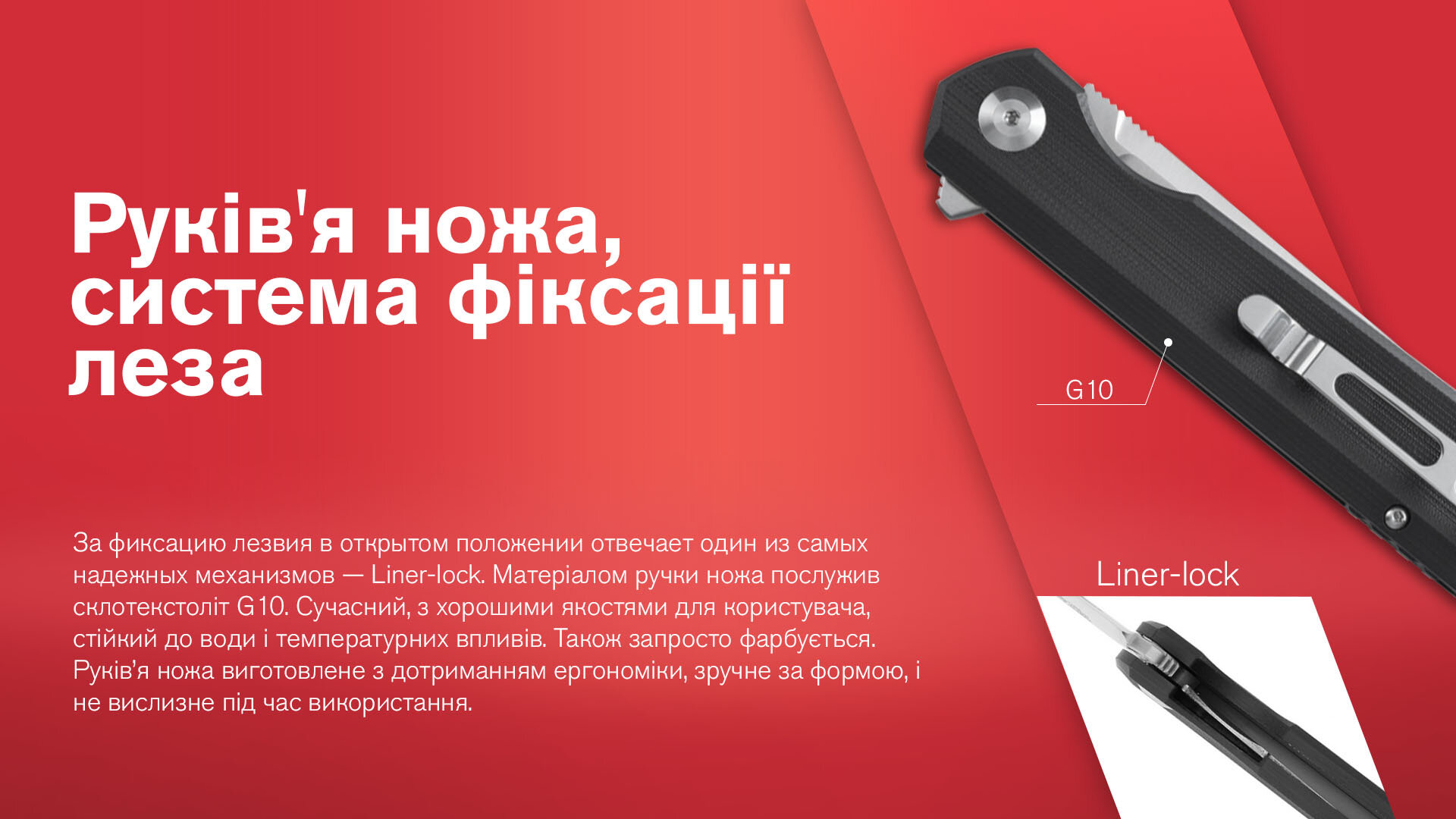 Ніж оснащений металевою кліпсою, за рахунок чого його застосування стає ще більш зручним. Ви можете зафіксувати ніж на кишені, на ремені, причепити його до сумки або рюкзаку. З досвіду використання колишніх виробів від Ganzoможно стверджувати, що ножі мають прекрасну механікою. Вони безпечні в застосуванні, легко відкриваються і закриваються. Замком для даної моделі служить конструкція типу Flipper. Складні ножі знайшли чималу популярність у користувачів. Компактні, зручні, легкі.