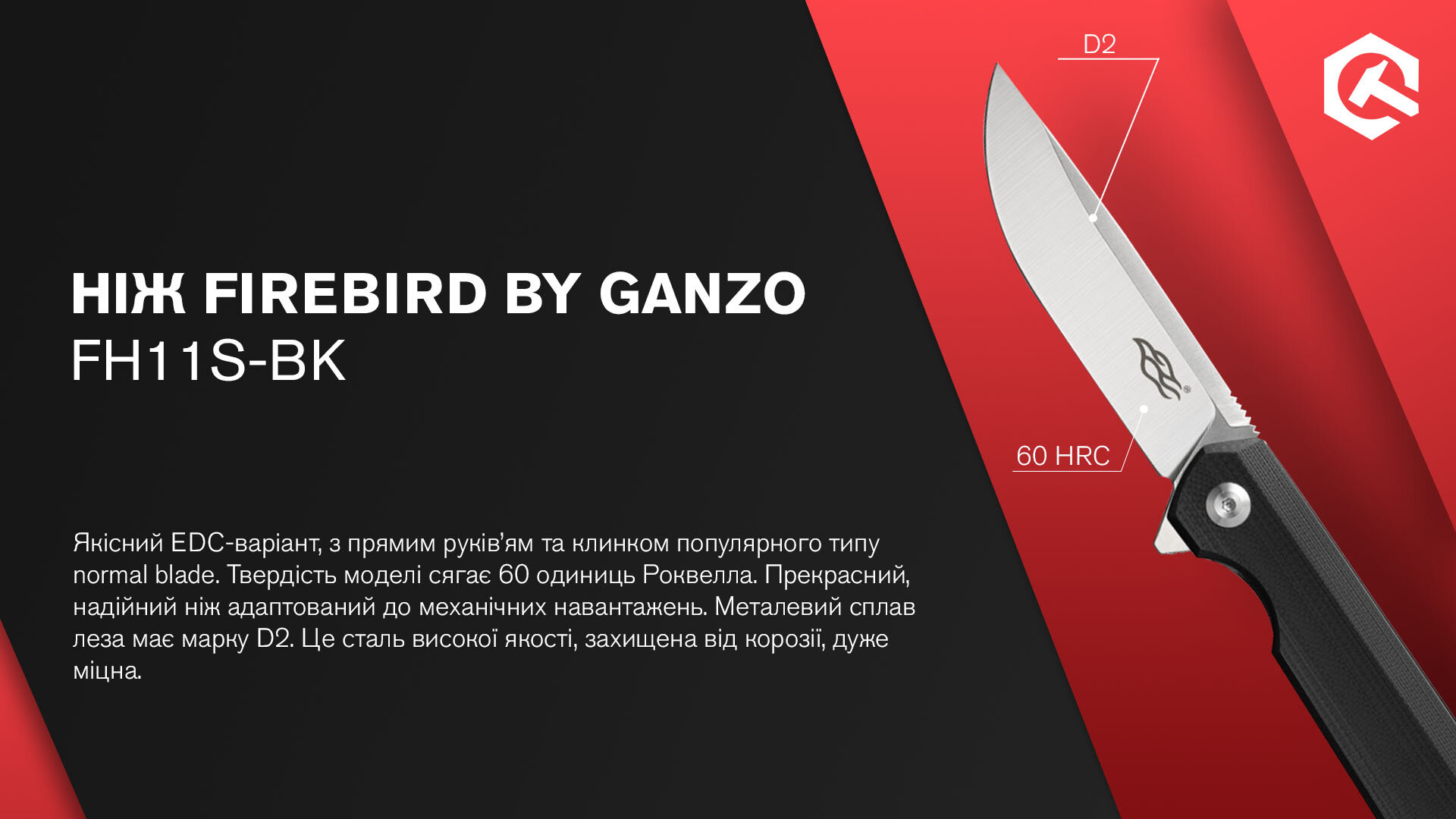 Новинка від GanzoFirebirdFH11S являє собою копію ножа FH11, вже знайомого покупцям. Однак ця новинка трохи менше по довжині. Якісний EDC-варіант, з прямою рукояттю і клинком популярного типу normal blade. Така форма леза трапляється досить часто, і його затребуваність обумовлена універсальністю застосування. Він годиться і для проколювання, і для нарізки. Що стосується ножа FH11S, то він сподобається любителям активного проведення часу. Ви можете брати з собою цей ніж в туристичний похід, на вилазку, в подорож і поїздку, а можете застосовувати суто вдома. У всіх випадках власник екземпляра FH11S залишиться задоволений його компактністю, елегантністю, ефективністю і практичністю. Поговоримо про ніж детальніше.