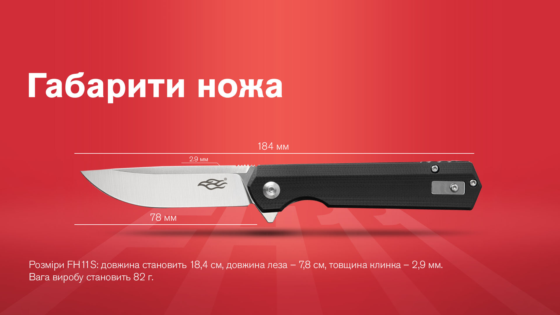 Розміри FH11S: довжина становить 18,4 сантиметра, довжина леза – 7,8 сантиметра, Товщина клинка – 2,9 міліметра. Вага виробу становить 82 грами. Слід акцентувати, що це міцний ніж, і ви запросто на нього зможете покластися. Модель зносостійка, належним чином збалансована. Колишні подібні ножі демонстрували хороші ріжучі властивості на практиці. Варто відзначити, що сталь марки D2, використовувана в багатьох таких виробах, довго утримує заточку. Ще одна перевага-Обробка поверхні ножів. Лезо моделей захищене від появи дрібних подряпин і незначних потертостей. Воно зберігає зовнішній вигляд і після довгої експлуатації. Якщо вас цікавить якісний ніж для щоденного носіння, то ця новинка від Ganzo– саме те. Вона стане в нагоді і в міських умовах, і в польових і похідних, при цьому, в догляді ніж невибагливий, а практична його користь очевидна.