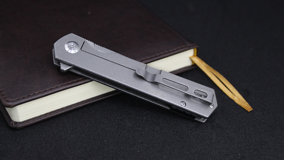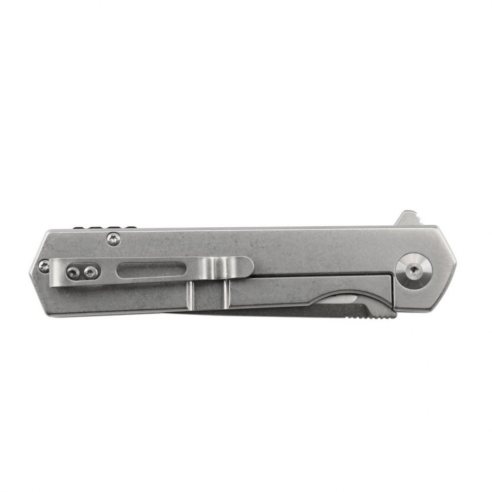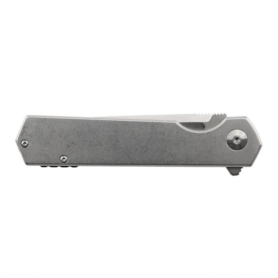 Рукоятка також повністю зроблена зі сталі, хоча для неї обраний нержавіючий метал. Вона дуже проста за формою і має лише виїмку під пальці знизу. До речі кажучи, ніж відкривається за допомогою плавника і у відкритому вигляді він дає додатковий захист пальцях, продовжуючи лінію цієї виїмки на рукоятці. Також на ручці ножа прикручена сталева кліпса, яку легко можна переставити на іншу сторону.