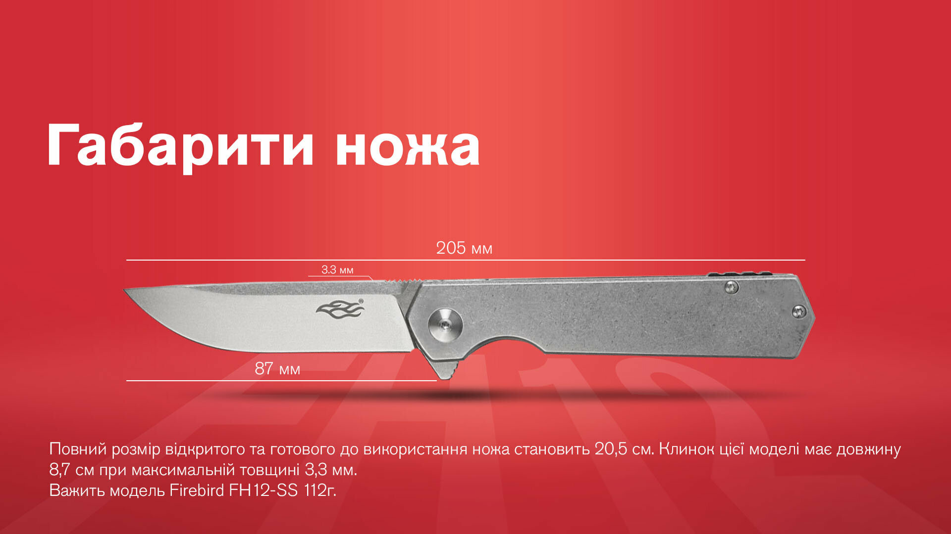 Повний розмір відкритого і готового до використання ножа становить 20,5 см. важить модель Firebird FH12-SS 112 г.