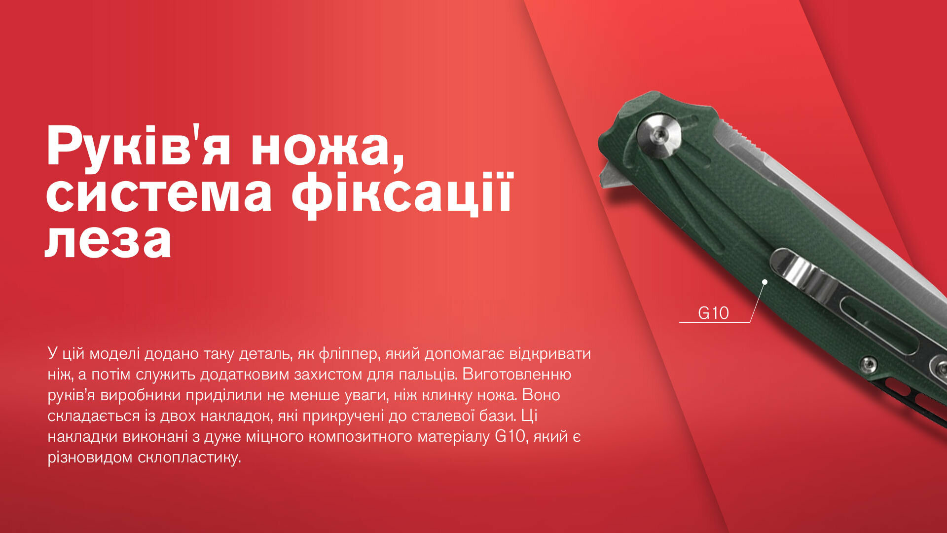 - ніж випускається з рукоятками чорного, зеленого і сірого кольору.