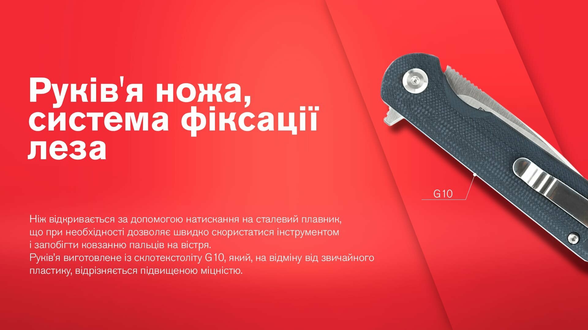 Накладки з композитного матеріалу G10 гарантують, що клинок залишиться неушкодженим навіть при падінні з висоти і контакті з кислотами. Склотекстоліт має високу міцність, не тріскається і не деформується під впливом екстремальних температур і надовго зберігає насичений колір, в тому числі при тривалому впливі ультрафіолетових променів. Шорстка поверхня накладок створює протиковзку поверхню, завдяки чому інструмент не вислизає з вологих рук.