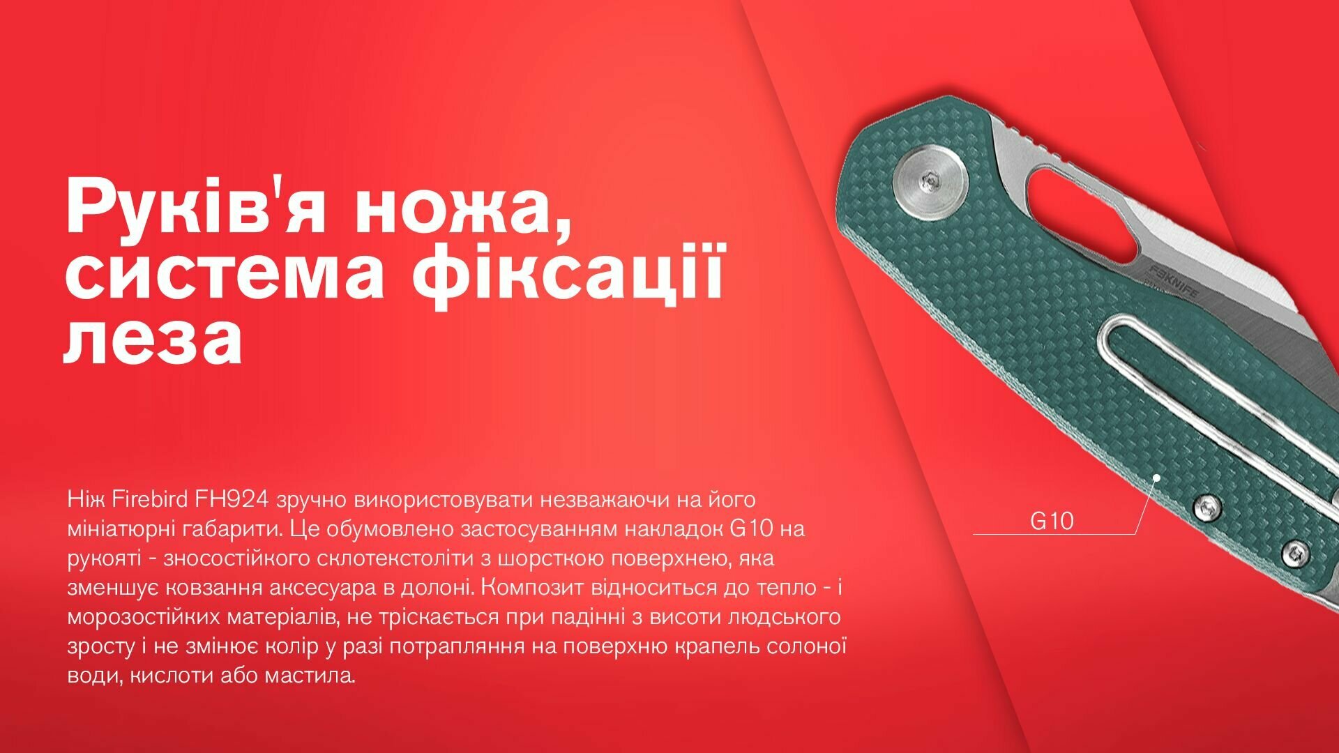 Ніж Firebird FH924 зручно використовувати незважаючи на його мініатюрні габарити, складові 16 см в розкритому положенні. Це обумовлено застосуванням накладок G10 на рукояті - зносостійкого склотекстоліти з шорсткою поверхнею, яка зменшує ковзання аксесуара в долоні. Композит відноситься до тепло - і морозостійких матеріалів, не тріскається при падінні з висоти людського зросту і не змінює колір у разі потрапляння на поверхню крапель солоної води, кислоти або мастила.