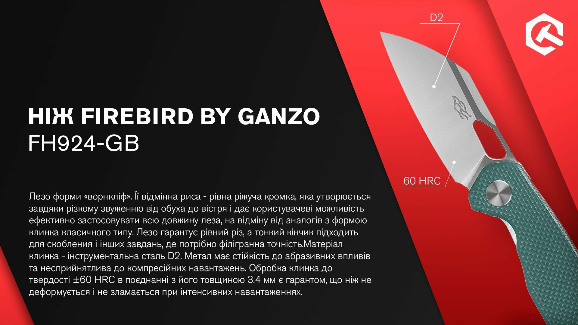 EDC ніж Firebird FH924 підходить для будь-яких видів діяльності, що вимагають гострого і надійного в експлуатації інструменту. Клинок зі сталі D2 має довжину 65 мм і замикається за допомогою замка Liner lock, що витримує навантаження близько 70 кг.Накладки на рукояті виготовлені з склотекстоліти G10 з шорсткою поверхнею. Вага моделі разом з кліпсою дорівнює 84 г.